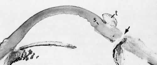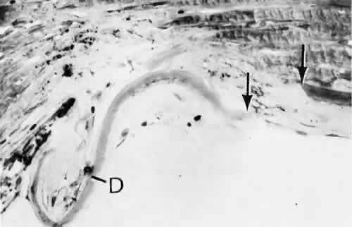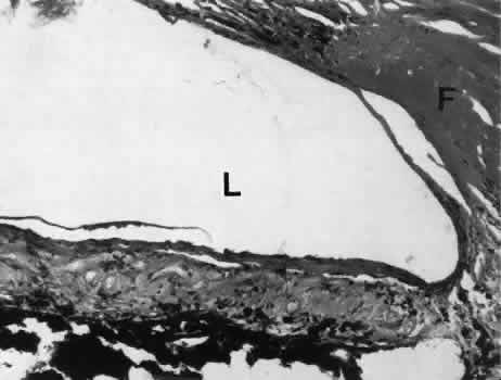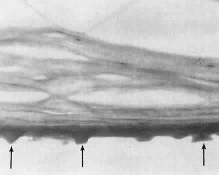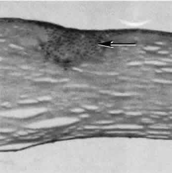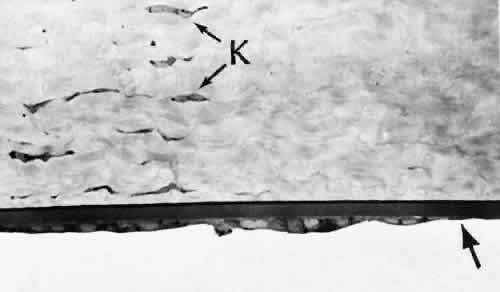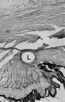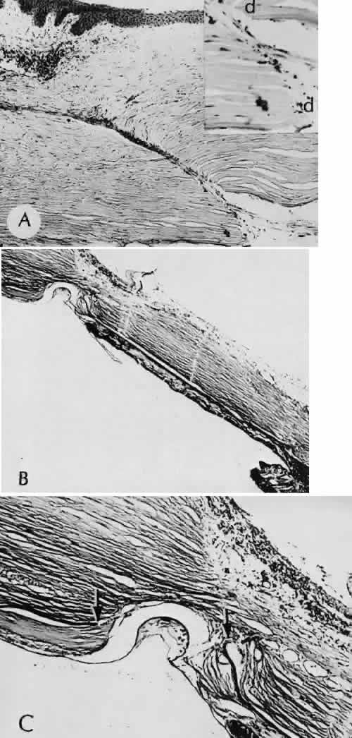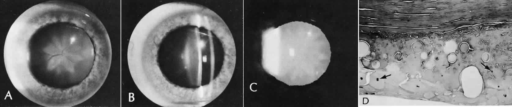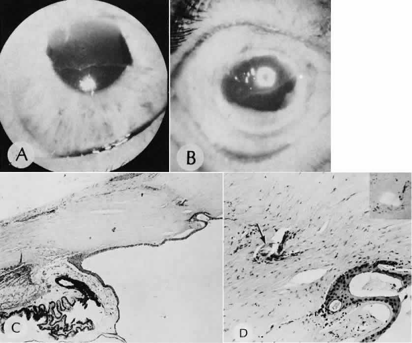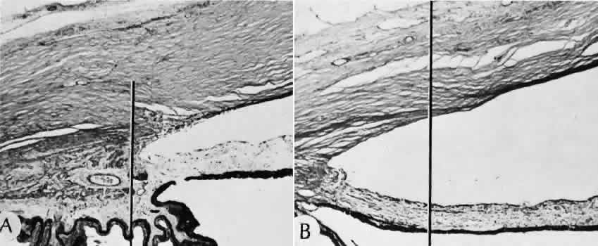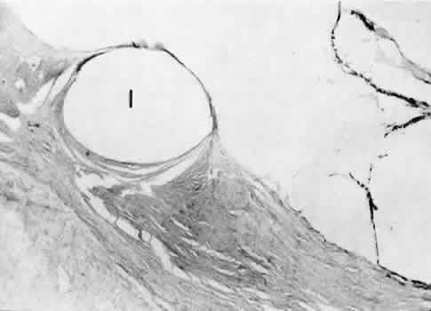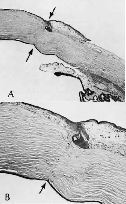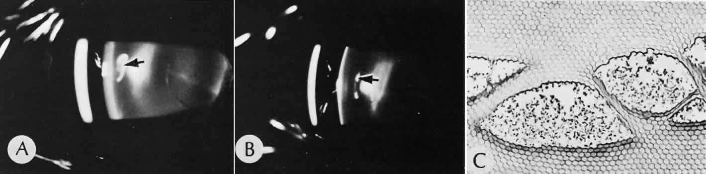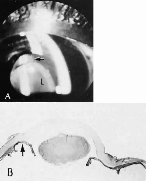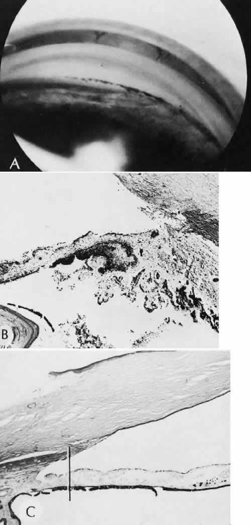 CATARACT EXTRACTION The cataract incision is made into the anterior chamber in such a way as not to injure the trabecular meshwork or unduly injure the cornea. The traditional cataract wound extends from the episcleral tissue posterior to the surgical limbus (defined by the insertion of the conjunctiva and Tenon's capsule) through the corneoscleral tissue to enter the anterior chamber by perforating Descemet's membrane anterior to Schwalbe's line. Clear corneal cataract incision involves only the peripheral cornea. Special circumstances may occur in which a more posterior or anterior route of incision may be desirable.55,56 The most reliable histologic landmark of a healed cataract incision (Fig. 14) is a hiatus of peripheral Descemet's membrane. The cut edges of Desce-met's membrane will curl inward toward the sclera.Endothelial cells may be absent or may have produced a new, thin, periodic acid-Schiff-positive Descemet's membrane over exposed corneal stroma. Occasionally, a fibrous plaque is present at the level of Descemet's membrane. This plaque is another example of fibrous metaplasia, in this instance of the corneal endothelial cells. The corneal stromal portion of the wound may be difficult to identify histologically, except in the early stages of healing. Clues to the position of the intrastromal tract include residual suture material, malorientation of collagen bundles, vascularization along the route of the incision, or incarceration of pigment, lens capsular remnants, or fragments of Descemet's membrane. The superficial portion of the wound tends to heal most completely. Breaks in Bowman's membrane will be present at the site of suture tracts and clear corneal cataract incisions. Also, areas of epithelial cell inclusion may be present in the substantia propria of the conjunctiva at the conjunctival incision. The capsulotomy incision is anterior to the insertion of the zonules through a relatively thick area of the anterior capsule. Most of the lens epithelial cells are removed with the anterior capsule, although some cells may remain in the region of the equator of the lens (Fig. 15). The residual lens capsule is thinnest at its posterior pole. The anterior capsular flap often adheres to the posterior capsule, encasing any residual cortical material and lens epithelial cells. Lens epithelial cells may grow to form large cells, called bladder cells, or may undergo fibrous metaplasia to form a collagenous plaque. Lens cortex outside the lens capsule has an amorphous appearance and is present only in the earliest postoperative specimens. Peripheral iridectomies are peripheral to the iris sphincter in the midportion of the iris rather than at the less accessible iris base. Complete or sector iridectomies include the iris sphincter but do not extend to the iris base. The edges of an iridectomy may show some rounding of contours, but granulation tissue does not form and iris pigment epithelial proliferation does not generally occur. The iris pigment epithelium may be absent for a considerable distance from an iridectomy produced by laser energy. Intraocular lens material (polymethylmethacrylate) often dissolves during tissue processing. Intraocular lenses containing metal components must be removed before embedding because metal will cause extensive artifacts and damage to microtome knives. Often the only clues to the presence of an intraocular lens are subtle compression changes of the iris or ciliary sulcus. Occasionally, residual synthetic material can be identified by polarized light. Anterior chamber lenses may cause a fibrous reaction in the anterior chamber angle (Fig. 16). Occasionally, collagenous tissue will completely encircle a lens (Fig. 17). Iris-supported lenses are associated with the loss of central iris pigment epithelium or residual nylon suture in the posterior chamber. Posterior chamber lenses are the most difficult to identify unless surrounded by lens remnants, in which case a negative image of the optic or loops can be seen. Sulcus-fixed lenses will show focal areas of iris pigment epithelial depigmentation or iris stromal erosion. The lens loop may displace the peripheral iris to come in contact with the trabecular meshwork. PENETRATING KERATOPLASTY Penetrating keratoplasty is a confusing term. The reference point of the incision is the globe; therefore, when a full-thickness graft is performed, the incision penetrates the globe but perforates the cornea. The concave-convex specimen usually is 7.0 to 8.5 mm in diameter and translucent because of fixation. Gross orientation of the specimen is important if pertinent changes are to be represented in the histologic section. Occasionally, as in keratoconus, the graft is placed axially and causes the pathologic area of thinning to be in an eccentric position in the graft. The area of the cone can be detected by observing the shadow of the specimen cast by a strong light. Descemet's membrane will not curl as extensively toward the stroma, as seen with in vivo wounds. Occasionally, Descemet's membrane is lost during tissue preparation because the membrane is easily sheared free of the corneal stroma. With repeat penetrating keratoplasty operations, the original corneal incision may or may not be represented in the specimen because of variations of size and position of the second graft procedure. Penetrating keratoplasty wounds in enucleation specimens can be identified by the changes in Descemet's membrane (Fig. 18). Because the donor tissue is often from a younger person, Descemet's membrane of the graft is thinner than the peripheral membrane of the host. Occasionally, redundant Descemet's membrane from the host intentionally will be left behind in this region by the surgeon. Often small areas of retrocorneal fibrous plaque mark the posterior area of the wound, even in cases of clinically uncomplicated wound healing. In time, the stromal portion of the wound may be undetectable histologically although some malorie