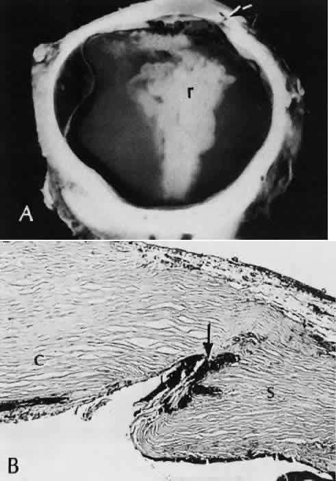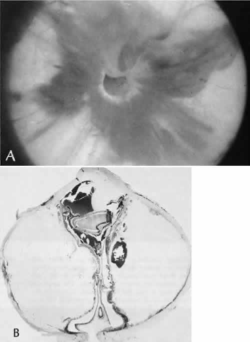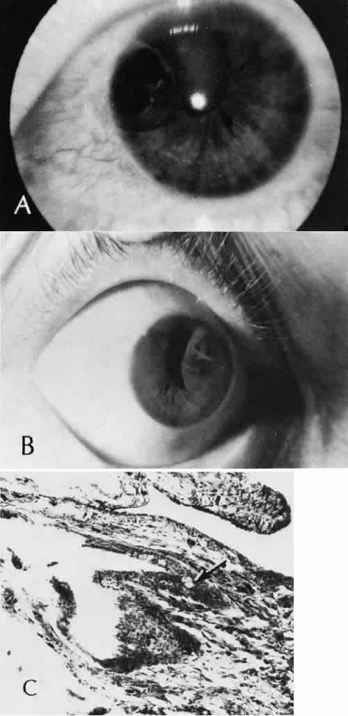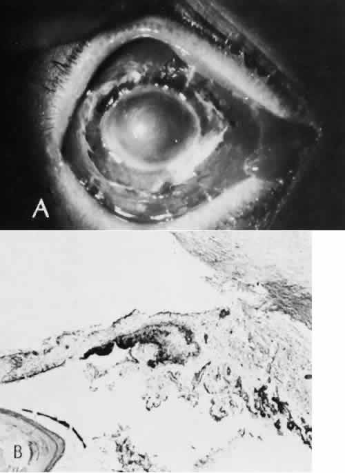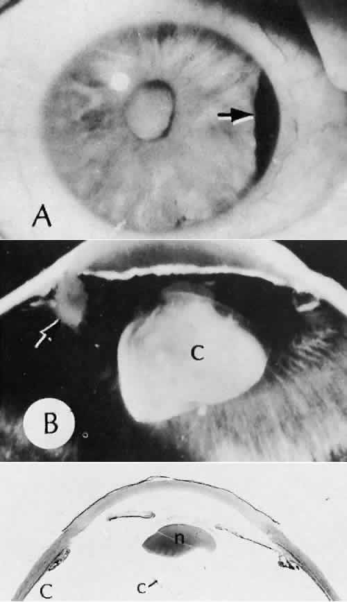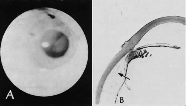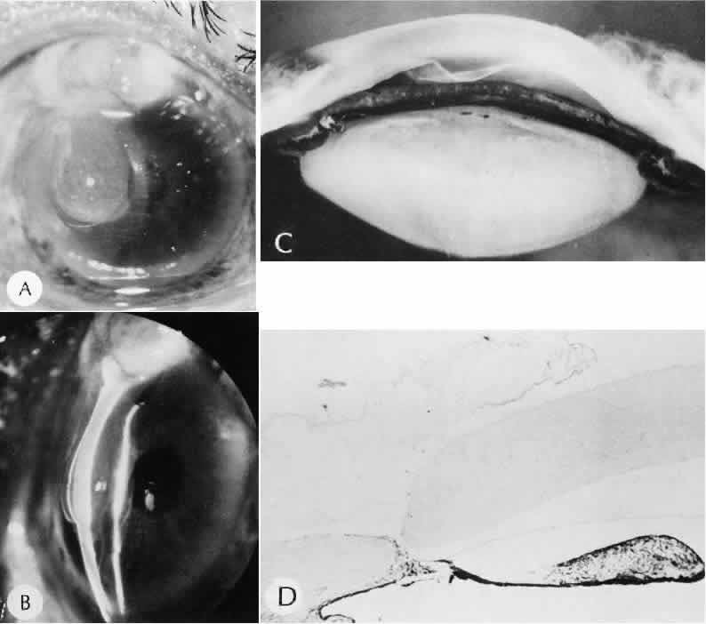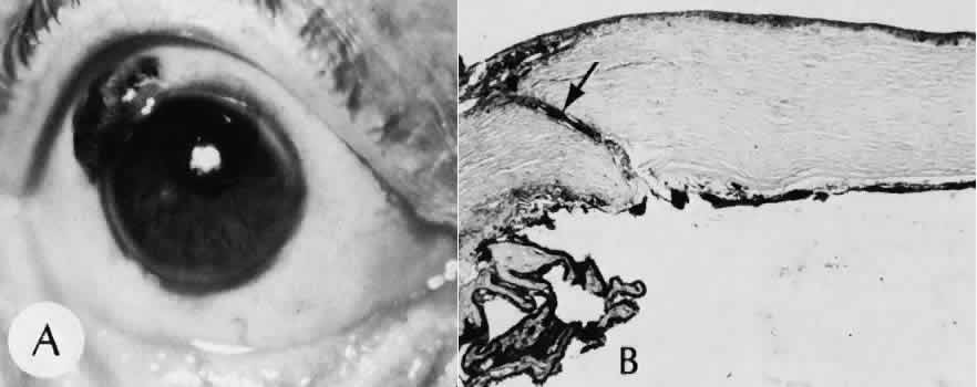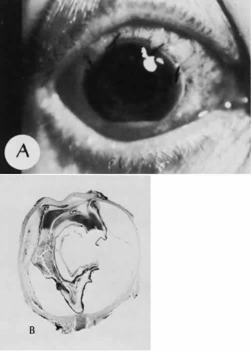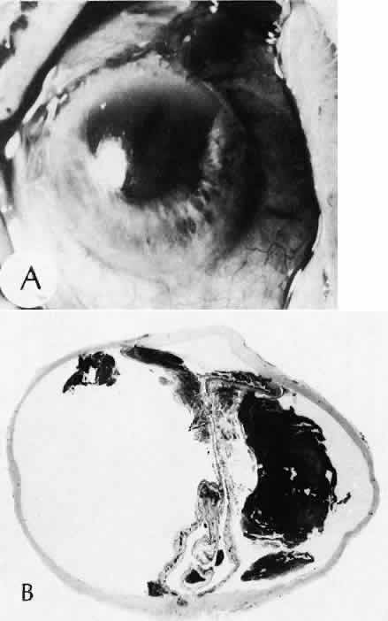 of agents may inflict different types of injuries of varying severity.159,160 One clinically useful classification of accidental ocular trauma is based on the type of injury; however, even in this classification, there are areas of overlap. Blunt trauma usually indicates that a small degree of tissue disruption exists. Penetrating or perforating trauma indicates a greater degree of tissue disruption. Intraocular foreign bodies imply a degree of tissue disruption often limited in extent but complicated by retention of some foreign material within the globe or accompanying microbial infection. Thermal and chemical injuries lead to special types of destructive processes. Radiation trauma usually produces vascular abnormalities but also may affect the crystalline lens. Finally, systemic trauma may indirectly affect the eye. BLUNT TRAUMA Compression and deformation of the eye are unusual occurrences because of the protection afforded the eye by the surrounding bones of the orbit, particularly the orbital rim. However, although no actual tissue loss occurs, the force of the blow may cause extensive injury to many of the delicate structures of the eye (Fig. 61).161 These same structures usually have only a limited ability to recover and repair the damage. Regions of the sclera are notably vulnerable to blunt trauma because of relative thinness. These areas include the limbus (Fig. 62), the insertions ofthe four rectus muscles, the insertion of the superior oblique, and the scleral canal (Fig. 63). Cornea Corneal epithelial abrasions may be large but usually will heal without serious sequelae. Deeper corneal involvement may result in focal areas of epithelial proliferation (facet formation, see above) or scar formation of the stroma. Endothelial cell distortion or rupture may result in multiple small ring opacities of the endothelium.162 The endothelial lesions become visible immediately after injury and become progressively more opaque over several hours. Depending on the degree of injury, the rings may disappear within days and result in no permanent loss of visual acuity. Histologically, swelling of the corneal endothelium and accumulation of fibrin and leukocytes on the injured endothelial cells cause the rings.163 More extensive endothelial cell damage is associated with stromal edema. Ruptures of Descemet's membrane allow aqueous to hydrate corneal stroma, which is normally relatively dehydrated. The swelling of the cornea reduces its transparency (corneal hydrops). The edema may resolve once the endothelial function is reestablished.164 Birth trauma is a common cause of rupture of Descemet's membrane. The area of rupture is often oriented diagonally across the central cornea.165 Histologically, whether the rupture is the result of birth trauma, congenital glaucoma, or trauma anytime after birth, a gap is seen in Descemet's membrane.166 The endothelium usually will migrate over the gap and form a new, thin Descemet's membrane. The time required for clinical improvement is generally between 6 weeks and 6 months.167 In attempting to cover the gap, the endothelium may grow into the anterior chamber over the free, rolled end of the ruptured Descemet's membrane and form a scroll-like structure.164 Corneal hydrops may also be complicated by corneal neovascularization167 or, rarely, by intralamellar pseudocyst formation.168 Keloid of the cornea (Fig. 64) is a hypertrophic scar that occasionally develops after ocular injury. Most keloids appear as glistening white masses that extend outward from the eye in the region of the cornea. Histologically, corneal perforation generally is present. Haphazardly arranged fibroblasts, collagen bundles, and blood vessels form the corneal scar.169,170 Anterior Chamber171 Blood in the anterior chamber (hyphema) may lead to a number of secondary complications.172–174 Even a small amount of blood in the anterior chamber is a clinically significant finding because its presence indicates the possibility of serious intraocular damage. In addition, there is a risk of a secondary (delayed) and often more serious hemorrhage occurring at the time of clot retraction.175 If the hemorrhage is extensive, the blood may totally fill the anterior chamber and completely replace the aqueous (8-ball or blackball hyphema).176 The extravasated blood will turn from bright red to black as the aqueous circulation ceases and the hemoglobin becomes deoxygenated. Multiple mechanisms in the setting of hyphema may lead to secondary glaucoma.177 Anterior chamber hemorrhage in hemoglobin sickle cell disease or in vitreous hemorrhage with access to the anterior chamber (hemolytic or ghost cell glaucoma) may cause occlusion of the trabecular meshwork. The sickle cell and ghost cell erythrocytes are rigid and cannot be filtered efficiently through the trabeculum. Macrophages filled with hemoglobin in sufficient quantity may also cause decreased aqueous filtration. A blood clot itself may tamponade the meshwork in the peripheral anterior chamber and cause pupillary block centrally. These mechanisms, which occur in the early posttraumatic period, are potentially reversible. In the chronic phases of healing, however, fibrous organization of a clot, fibrosis of the trabecular meshwork, endothelialization of the trabecular meshwork, or peripheral anterior synechiae formation may lead to permanent secondary glaucoma (Fig. 65). Blood breakdown products from hyphema may diffuse into the cornea and cause a reddish orange opacification of the stroma (blood staining of the cornea). The extent of the deposition of hemoglobin depends on the degree of damage to the endothelium and on the degree of increase in the intraocular pressure.178 With sufficient damage to the endothelium, bloodstaining may occur even at low levels of intraocular pressure. Histologically, hemoglobin particles can be seen by routine stains to be distributed throughout the corneal stroma. Hemosiderin, a metabolic product of hemoglobin, 