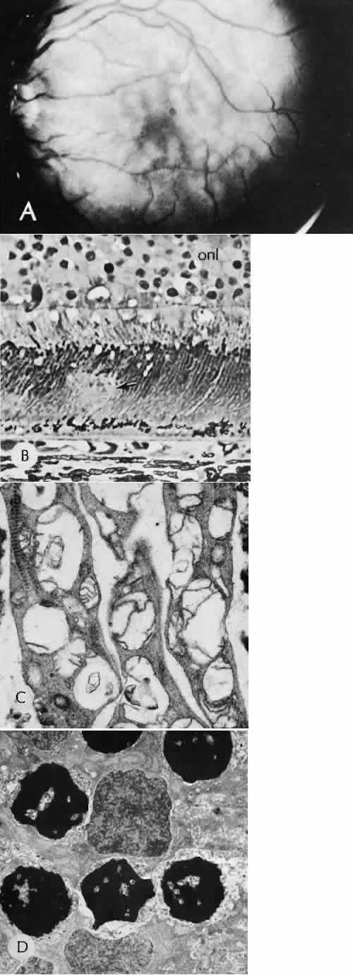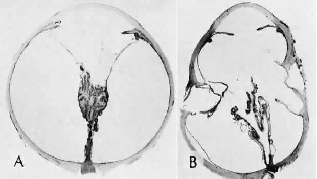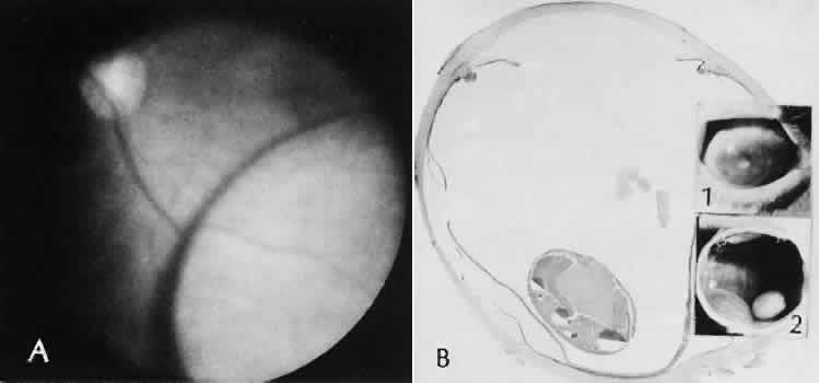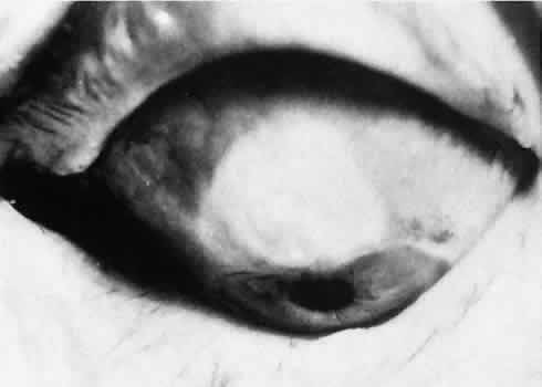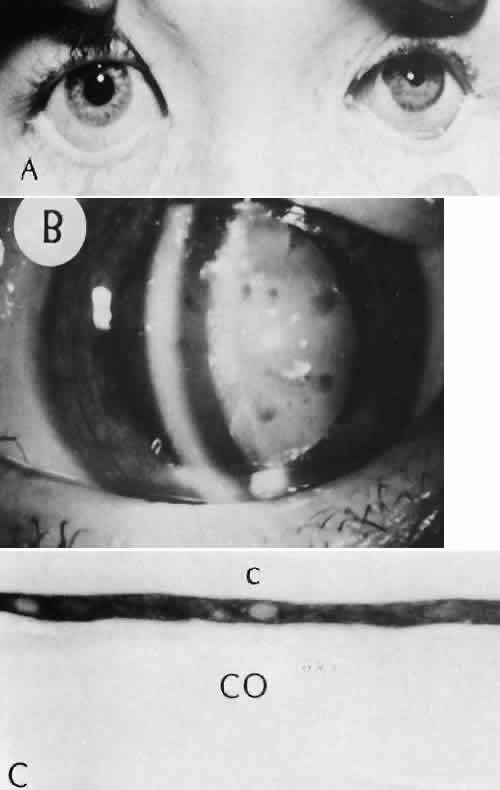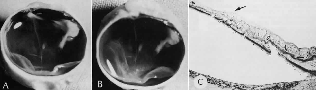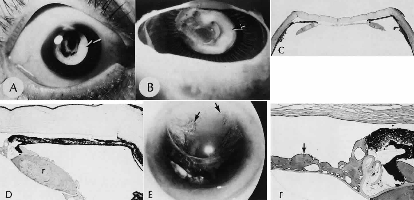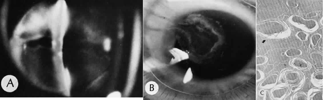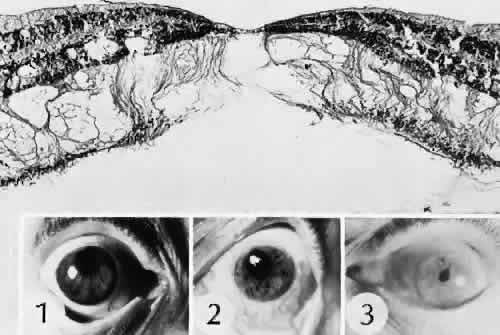 of agents may inflict different types of injuries of varying severity.159,160 One clinically useful classification of accidental ocular trauma is based on the type of injury; however, even in this classification, there are areas of overlap. Blunt trauma usually indicates that a small degree of tissue disruption exists. Penetrating or perforating trauma indicates a greater degree of tissue disruption. Intraocular foreign bodies imply a degree of tissue disruption often limited in extent but complicated by retention of some foreign material within the globe or accompanying microbial infection. Thermal and chemical injuries lead to special types of destructive processes. Radiation trauma usually produces vascular abnormalities but also may affect the crystalline lens. Finally, systemic trauma may indirectly affect the eye. BLUNT TRAUMA Compression and deformation of the eye are unusual occurrences because of the protection afforded the eye by the surrounding bones of the orbit, particularly the orbital rim. However, although no actual tissue loss occurs, the force of the blow may cause extensive injury to many of the delicate structures of the eye (Fig. 61).161 These same structures usually have only a limited ability to recover and repair the damage. Regions of the sclera are notably vulnerable to blunt trauma because of relative thinness. These areas include the limbus (Fig. 62), the insertions ofthe four rectus muscles, the insertion of the superior oblique, and the scleral canal (Fig. 63). Cornea Corneal epithelial abrasions may be large but usually will heal without serious sequelae. Deeper corneal involvement may result in focal areas of epithelial proliferation (facet formation, see above) or scar formation of the stroma. Endothelial cell distortion or rupture may result in multiple small ring opacities of the endothelium.162 The endothelial lesions become visible immediately after injury and become progressively more opaque over several hours. Depending on the degree of injury, the rings may disappear within days and result in no permanent loss of visual acuity. Histologically, swelling of the corneal endothelium and accumulation of fibrin and leukocytes on the injured endothelial cells cause the rings.163 More extensive endothelial cell damage is associated with stromal edema. Ruptures of Descemet's membrane allow aqueous to hydrate corneal stroma, which is normally relatively dehydrated. The swelling of the cornea reduces its transparency (corneal hydrops). The edema may resolve once the endothelial function is reestablished.164 Birth trauma is a common cause of rupture of Descemet's membrane. The area of rupture is often oriented diagonally across the central cornea.165 Histologically, whether the rupture is the result of birth trauma, congenital glaucoma, or trauma anytime after birth, a gap is seen in Descemet's membrane.166 The endothelium usually will migrate over the gap and form a new, thin Descemet's membrane. The time required for clinical improvement is generally between 6 weeks and 6 months.167 In attempting to cover the gap, the endothelium may grow into the anterior chamber over the free, rolled end of the ruptured Descemet's membrane and form a scroll-like structure.164 Corneal hydrops may also be complicated by corneal neovascularization167 or, rarely, by intralamellar pseudocyst formation.168 Keloid of the cornea (Fig. 64) is a hypertrophic scar that occasionally develops after ocular injury. Most keloids appear as glistening white masses that extend outward from the eye in the region of the cornea. Histologically, corneal perforation generally is present. Haphazardly arranged fibroblasts, collagen bundles, and blood vessels form the corneal scar.169,170 Anterior Chamber171 Blood in the anterior chamber (hyphema) may lead to a number of secondary complications.172–174 Even a small amount of blood in the anterior chamber is a clinically significant finding because its presence indicates the possibility of serious intraocular damage. In addition, there is a risk of a secondary (delayed) and often more serious hemorrhage occurring at the time of clot retraction.175 If the hemorrhage is extensive, the blood may totally fill the anterior chamber and completely replace the aqueous (8-ball or blackball hyphema).176 The extravasated blood will turn from bright red to black as the aqueous circulation ceases and the hemoglobin becomes deoxygenated. Multiple mechanisms in the setting of hyphema may lead to secondary glaucoma.177 Anterior chamber hemorrhage in hemoglobin sickle cell disease or in vitreous hemorrhage with access to the anterior chamber (hemolytic or ghost cell glaucoma) may cause occlusion of the trabecular meshwork. The sickle cell and ghost cell erythrocytes are rigid and cannot be filtered efficiently through the trabeculum. Macrophages filled with hemoglobin in sufficient quantity may also cause decreased aqueous filtration. A blood clot itself may tamponade the meshwork in the peripheral anterior chamber and cause pupillary block centrally. These mechanisms, which occur in the early posttraumatic period, are potentially reversible. In the chronic phases of healing, however, fibrous organization of a clot, fibrosis of the trabecular meshwork, endothelialization of the trabecular meshwork, or peripheral anterior synechiae formation may lead to permanent secondary glaucoma (Fig. 65). Blood breakdown products from hyphema may diffuse into the cornea and cause a reddish orange opacification of the stroma (blood staining of the cornea). The extent of the deposition of hemoglobin depends on the degree of damage to the endothelium and on the degree of increase in the intraocular pressure.178 With sufficient damage to the endothelium, bloodstaining may occur even at low levels of intraocular pressure. Histologically, hemoglobin particles can be seen by routine stains to be distributed throughout the corneal stroma. Hemosiderin, a metabolic product of hemoglobin, 