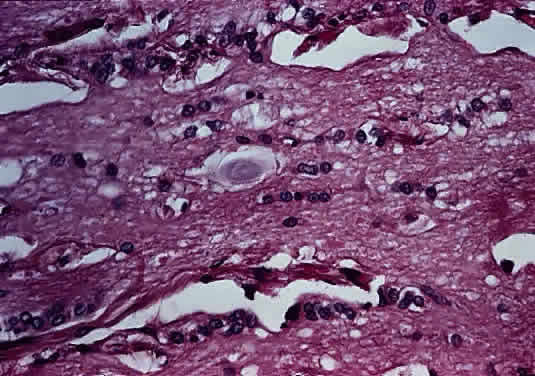 Symptoms are typically rapid in onset and always include subjective vision loss. If accompanied by an acute onset of pain, a diagnosis of temporal arteritis or optic neuritis may be considered, particularly if there is a response to steroids. Absence of light perception and visual-field defects are present in 80% to 90% of patients. Because most tumors do not involve the intraorbital segment of the optic nerve, proptosis is present in only a minority of cases. The early radiographic features may be nonspecific, with only slight enlargement and enhancement of the nerve.42 The chiasm is typically expanded. Diffuse optic nerve gliomas produce enlargement of the nerve, which is typically described as reddish and smooth. Higher-grade neoplasms may have a soft and friable consistency. Histologically, there is diffuse expansion of the nerve by atypical cells (Fig. 41). Mitotic figures and foci of necrosis may be evident. The absence of Rosenthal fibers and granular bodies helps to exclude pilocytic astrocytoma and demyelination. Malignant gliomas of the optic nerve usually arise from the astrocyte. A single report of an optic nerve oligodendroglioma has been published.43