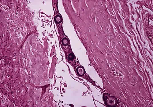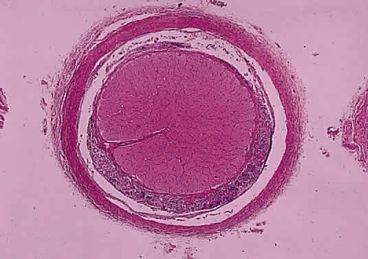 OPTIC NERVE SHEATH The optic nerve is invested by a sheath that is continuous posteriorly with the intracranial dura mater and the periorbita in the orbital apex; anteriorly, it fuses with the sclera. The arachnoid is composed of loose connective tissue continuous with that of the cranium. Meningocytes (arachnoid cells) may be found in nests, some of which contain calcified bodies (psammoma bodies; Fig. 8). The subarachnoid space is continuous with that of the cranium. Investing the nerve closely is the pia, which sends fibrovascular septa into the nerve, dividing it into fascicles. The pia blends with the lamina cribrosa and the connective tissue around the central vessels, so that the central retinal artery and vein have a common connective tissue sheath (Fig. 9). The optic nerve sheath, immediately behind the eye, is typically somewhat loose.