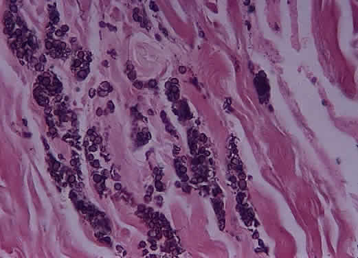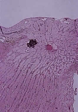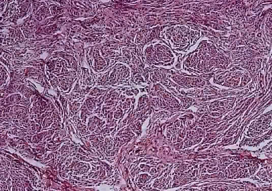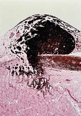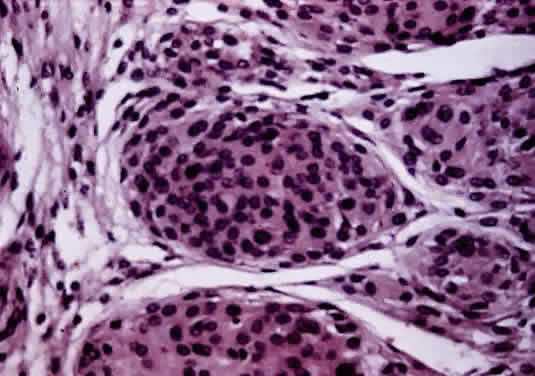 site to the other. Primary tumors of the disc head include the astrocytic hamartoma, which may be seen with tuberous sclerosis or neurofibromatosis, rare pigment epithelial proliferations, hemangioma, peripapillary choroidal melanoma, and melanocytoma. The melanocytoma is a benign, deeply pigmented tumor that arises from dendritic melanocytes incorporated within the optic disc (Fig. 34). It may also arise in any part of the uveal tract. Commonly, it is situated eccentrically on the disc and projects for 2 mm or less into the vitreous. It extends into the lower temporal retina and posteriorly beyond the lamina. Bleached sections show closely apposed plump cells, with abundant cytoplasm. The nuclei have appreciable chromatin; nucleoli, when present, are small and regular. The intense pigmentation blocks fluorescein angiography. As an entity, it is more common in blacks and Mediterranean races. It also occurs in whites; as the tumor may grow and undergo necrosis, there may be difficulty in distinguishing it clinically from melanoma. The melanocytoma, however, does not metastasize. Distinguishing this tumor from a peripapillary uveal melanoma that grows over the disc and may invade the vitreous and the optic nerve is important. The borders of a melanocytoma, as seen by ophthalmoscopy, tend to feather out, in contrast to the borders of a melanoma.