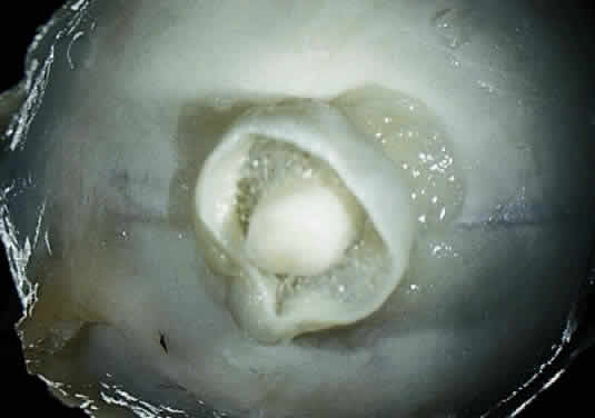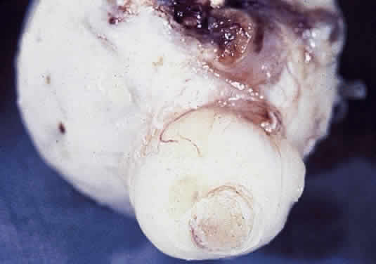 appears flattened and has a white scleral crescent. Microscopically, the
