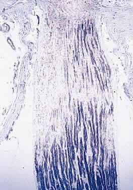 Transverse Inflammation that extends from the meninges into the pia affects the peripheral nerve bundles. A continuous exudate, such as is seen in a granulomatous inflammation due to fungi or acid-fast bacilli, leads to atrophy of the peripheral nerve bundles and thus a periaxial atrophy. In axial neuropathy, the macular fibers are predominantly affected. These fibers are particularly susceptible to involvement in multiple sclerosis and in tobacco or alcohol amblyopia. Both periaxial and axial forms may extend and affect the optic nerve transversely. Papillitis refers to inflammation of the disc; it is usually accompanied by a vitreous haze due to the presence of inflammatory cells. Commonly, it is seen with suppurative endophthalmitis and panophthalmitis. The disc shows edema, perivenous cuffing by chronic inflammatory cells, and astrocytic proliferation. Thin bands of connective tissue may spread from the disc surface into the vitreous and cover the adjacent retina. Loss of myelin may occur with all the pathologic processes described above and also with trauma and neoplasm; this type of demyelination is secondary. Primary demyelination refers to demyelinating disease of unknown etiology (Figs. 24 and 25). Loss of myelin occurs early but initially the axons are undamaged (disseminated sclerosis, acute disseminating myelitis), so that visual function may return. The damaged myelin is removed by macrophages followed by astrocytic proliferation, which produces a glial scar or plaque (Fig. 26).