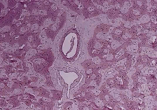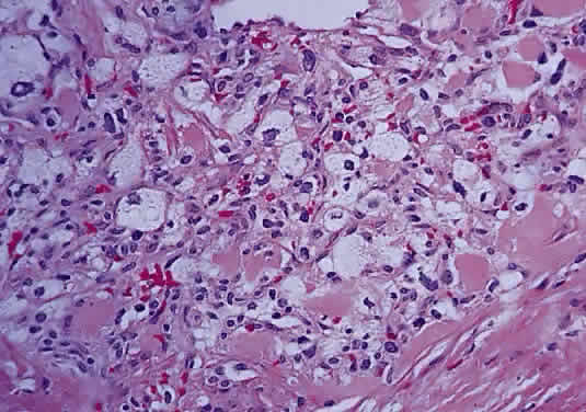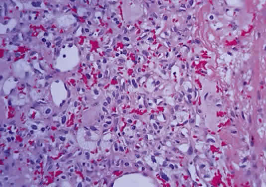 In fibroblastic meningiomas, the cellularity is less and much of the tumor is composed of spindle-shaped cells within a collagen-rich matrix. Transitional tumors, as the name suggests, have features of both meningotheliomatous and fibroblastic differentiation. Typically, the spindle cells are located around the periphery of whorls. In the past, the term “angioblastic” meningioma was used to describe tumors with numerous and prominent vascular spaces. Investigations, however, indicate that most of these tumors represent examples of hemangiopericytoma, a mesenchymalderived neoplasm with a distinctly more aggressive natural history than the ordinary meningioma. As with optic nerve glioma, the approach to the management of optic nerve sheath meningioma is a complicated and a controversial subject.46,53–55 Left untreated, the tumors continue to grow and eventually may extend intracranially and even to the contralateral nerve. Factors which must be considered when planning therapy include patient age, tumor location, size and extent, visual status, and degree of proptosis. The role of adjuvant radiotherapy remains unclear but early results are cause for encouragement.45,55,56 HEMANGIOBLASTOMA Hemangioblastoma of the optic nerve is rare; fewer than 20 cases are reported in the literature.57,58 Males and females have been equally affected; the patient age range is from 15 to 44 years. Most reported cases have occurred in association with von Hippel-Lindau syndrome (VHL), an inherited autosomal dominant condition associated with an abnormal tumor suppressor gene on the short arm of chromosome 3. Patients with VHL have a predilection to develop hemangioblastomas of the retina, optic nerve, cerebellum, and spinal cord; cysts of the pancreas, kidneys, and liver; and renal cell carcinoma. Overall, about 25% of patients with hemangioblastoma manifest the stigmata of VHL but this rises to 70% when the optic nerve is involved. All reported hemangioblastomas have been prechiasmal and all but one were unilateral. Tumors may either be exclusively intraorbital or intracranial, or they may extend through the optic foramen to involve both the intraorbital and intracranial portions of the optic nerve. The presenting symptom in nearly all cases was loss of vision, sometimes accompanied by headaches or a sensation of eye pressure. Proptosis is a common finding in intraorbital tumors. Imaging studies typically demonstrate a vascular, homogeneously enhancing mass that enlarges or replaces the optic nerve. Imaging is also useful in distinguishing hemangioblastoma from such entities as aneurysm, meningioma, glioma, and metastasis. Intraoperatively, hemangioblastoma appears as a reddish, circumscribed tumor that typically is well demarcated from the nerve, although often the central portion is involved. Microscopically, the most striking feature is the abundance of vascular channels, most of which have the appearance of capillaries. Reticulin-staining highlights the vascular network. Between them are stromal cells containing abundant vacuolated cytoplasm, which is due to the presence of lipid. Although bland, the nuclei of the stromal cells are variable in appearance and may exhibit focal marked hyperchromasia (Figs. 46 and 47). Electron microscopy shows that the large stromal cells contain intracytoplasmic particles of lipid and glycogen. Scattered foci of extramedullary hematopoiesis may be present as a consequence of erythropoietin production by the tumor cells. Mast cells also are often readily identifiable. Small cysts are frequent, and the cyst wall consists of gliosis, in which may be found numerous Rosenthal fibers.
