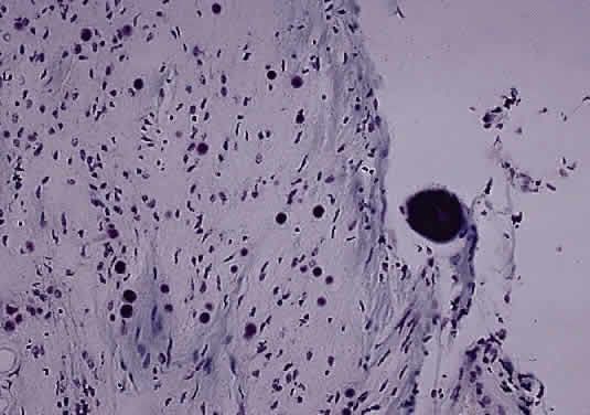 Histologically the common types of meningioma include the meningotheliomatous, transitional, fibroblastic, and psammomatous meningiomas. In most instances, the cells bear some resemblance to arachnoid cells (Fig. 44). Variations in their cytologic features and architectural arrangements produce a broad spectrum of microscopic appearances. The most common type within the orbit is the meningotheliomatous type that is composed of lobules and sheets of neoplastic cells with typically indistinct cell borders (syncytial arrangement). The ultrastructural basis for this latter phenomenon is the complex interdigitation of cytoplasmic extensions. Individual nuclei are oval with light-staining chromatin and small nucleoli. Intranuclear cytoplasmic pseudoinclusions are usually readily evident. The cytoplasm is uniform and lightly eosinophilic. Whorls of cells, in which the cells arrange themselves in concentric layers akin to the layers of an onion, are found in nearly all meningiomas and are one of the most helpful diagnostic features (Fig. 45) Psammoma bodies—concentric laminated mineralized concretions typically centered on whorls—are present in varying number in most meningiomas; when particularly abundant, the tumor is referred to as a psammomatous meningioma.