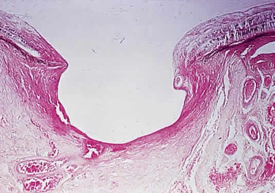 about the 30th week of gestation, extends distally as far as the laminar