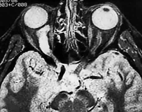 Modern imaging techniques have greatly facilitated the evaluation of optic nerve sheath meningioma and glioma.29 Plain orbital radiographs occasionally show abnormalities of the optic foramen and calcification. Imaging studies (CT and MRI) show diffuse tubular or less commonly, globular enlargement of the nerve sheath complex (Fig. 43).49,50 As with its intracranial counterpart, the optic nerve meningioma typically enhances brightly. “Tram-tracking” results when the thickened sheath outlines the uninvolved central nerve from which it is sharply demarcated. Although characteristic of optic nerve meningioma, this is not specific and can be seen in inflammatory conditions and rarely even in optic nerve glioma. Precise localization of the extent of the tumor is determined with MRI studies, particularly with fat-saturation techniques. Dilation of the anterior perioptic space (perioptic cyst) between the anterior edge of the tumor and the globe is seen in instances in which the tumor does not encroach on the globe and is a distinct and common feature.51,52