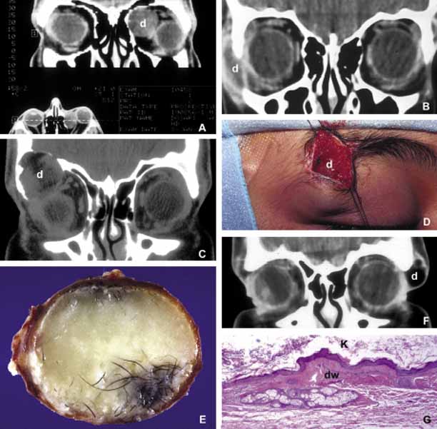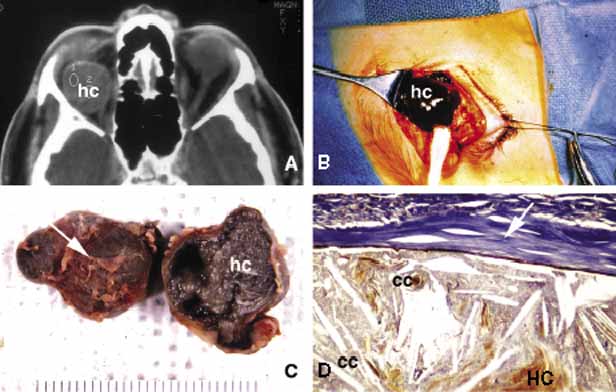 ANOPHTHALMOS/MICROPHTHALMOS When the globe is abnormally developed, microphthalmos, congenital cystic eye, and extremely rarely, anophthalmos occur. Microphthalmos usually occurs as a unilateral condition and in approximately 10% of cases it is associated with other craniofacial malformations including agenesis of the corpus callosum, polymicrogyria, and mid-line arachnoidal cysts. Microphthalmos may be seen as a part of several genetically determined neuronal migration disorders such as Walker-Warburg syndrome, Aicardi syndrome, and Fukuyama congential muscular dystrophy.9,10 In cases of microphthalmos and anophthalmos the orbit may be well formed but does not develop to a full adult volume. The mechanism by which the presence of the globe effects the growth of the orbit is not well understood. Microphthalmos may be associated with a colobomatous cyst as a result of the abnormal closure of the embryonic optic fissure leading to the prolapse of neuroectodermal tissues into the orbit (Fig. 1) This cystic structure may increase rapidly in size to overshadow the abnormal globe and may be confused with a neoplasm. When cystic lesions in the orbit are suspected imaging studies should be performed not only to look for other intracranial abnormalities but also to establish the possible connection of the cyst to the colobomatous globe versus to abnormally formed meninges.11 Macrophthalmos (buphthalmos) may also rarely develop as a congenital anomaly in patients with Sturge-Weber syndrome and rarely in neurofibromatosis type I. ORBITO-CRANIAL MALDEVELOPMENTS Cephalocele results from the extension of maldeveloped CNS tissues including meninges (meningocele), brain parenchyma (encephalocele), and the combination of the two (meningoencephalocele) into the orbital cavity.12,13 Intraorbital cephaloceles may develop anteriorly at the suture lines of orbital bones or posteriorly extending into the orbit from orbital fissures and the optic canal. Depending on the combination of these herniations they contain brain and/or meningeal tissues (Fig. 1). Aberrant fibroglial tissue has also been described in the orbit.14 Hamartoma is a tumor-like proliferation of tissues that normally exist at a given body location. The best examples of orbital hamartomas are the vascular hamartomatous lesions that are composed of vascular elements including capillary endothelial cells, distended or collapsed cavernous blood and lymph vessels, tortuous arterial and venous channels with or without anastomoses, etc. Other examples of hamartomatous orbital tumors include neurofibroma and lipomatous hamartoma.15 Choristoma, however, is a tumor-like proliferation of tissues that are not normally present at a given body location. The most commonly encountered example of orbital choristoma is a dermoid.16 Dermoids that present with many varieties result from the entrapment of epithelial structures at the site of closure of fetal fissures. Superficial dermoid cysts occur primarily subcutaneously anterior to orbital septum or within the anterior orbit. If the cyst wall is made of epidermis without dermal tissues, it is classified as an epidermoid cyst. These lesions are occasionally lined by conjunctival or pseudostratified respiratory epithelium.17 The superficial lesions must be distinguished from deep orbital dermoids that are usually rounded, encapsulated tumors filled with fatty materials, keratin, and dermal structures such as hair particles. Histopathologically the dermoid wall is lined by keratizing squamous epithelium with dermal appendices including hair follicles and sebaceous and eccrine glands.18 Most of the dermoids are well outlined by ultrasonography because of their anterior location thus making CT or MRI rarely necessary.19 If the dermoid is unusually large or located at the frontal zygomatic suture, CT is necessary to document the relationship of the lesion to the bone before surgical intervention. Rarely, dermoids at the fronto-zygomatic suture may develop dumbbell-shaped lesions partially within the orbit and partially extending into the temporal fossa.20,21 Unusually large superior orbital dermoids particularly those that leak and create granulomatous reaction within adjacent soft tissues may erode the bone and extend into the frontal sinus or the cranium (Fig. 2). ORBITAL TERATOMA Teratoma is a germ-cell tumor that contains tissues derived from endoderm, ectoderm, and mesoderm22 (Fig. 1). Therefore, these lesions may contain skin, bowel, lung, brain, thyroid, cartilage, and bone tissues. Most teratomas develop unilaterally and in girls. A majority of these congenital tumors are benign. Occasional reports have documented malignant transformation within orbitocranial teratomas.23 However, these benign tumors continue to grow after birth because of the collection of secretions from different tissues into the partially cystic spaces of the tumor. Some teratomas create massive proptosis and most can only be treated by exenteration. However, some of these lesions have recently been reported to be removed surgically with preservation of the globe and other vital orbital structures. TRAUMA Mechanical Injury Orbital injuries result from the absorption of kinetic energy that occurs whenever the orbital tissues contact an object moving at a different speed.25 The orbital rim is capable of absorbing a considerable amount of kinetic energy without being fractured. Yet, a variety of impact forces striking the orbit may result in fractures in different areas.26 The absorption of the kinetic energy by an orbital bone may lead to contusion and/or laceration of the skin and superficial soft tissues, local deformation of the adjacent structures, globe, orbital soft tissues and bones and increases pressure in the orbital cavity. A common end result of an orbital impact is the fracture of the floor and/or the medial wall (lamina papyracea)27 (Fig. 3). Fractures of other orbital bones occur less often. Foreign bodies may be introduced 