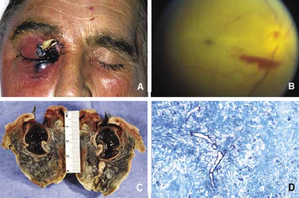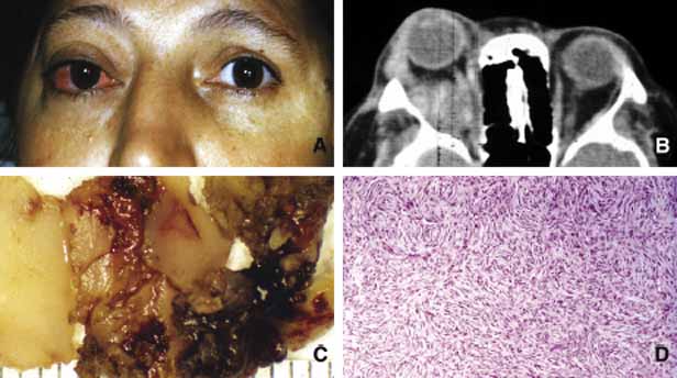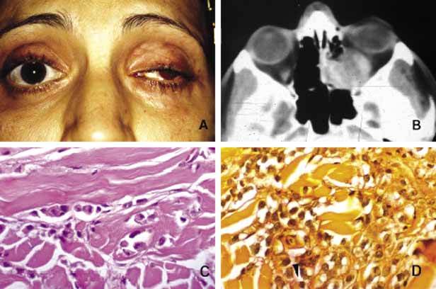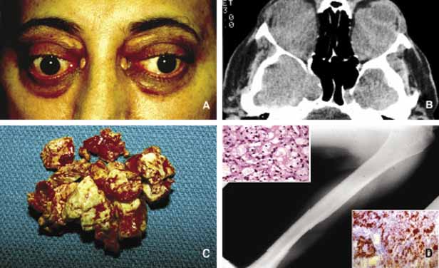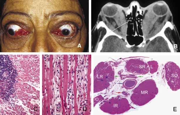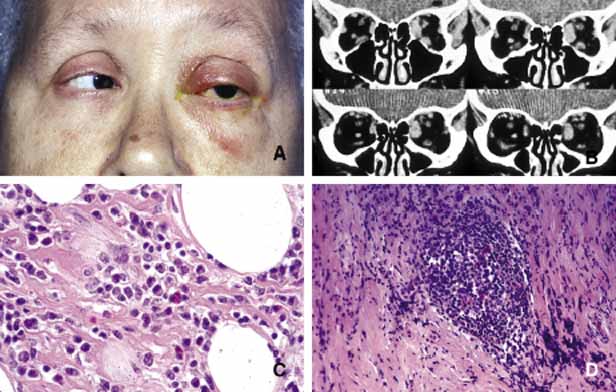 Orbital cellulitis may also be caused by different types of foreign bodies including organic and nonorganic matter and nonautogenous surgical implants.28 Inorganic foreign materials, such as metal and glass, are usually well-tolerated and do not cause infection unless they significantly distort the orbital anatomy with exposure to periorbital sinuses and nasal cavity. Organic foreign bodies such as wood, vegetable fibers, etc., however, trigger significant foreign body reaction and sometimes suppurative inflammation.These should be documented by CT and/or MRI and surgically removed29 (Fig. 3). Today many nonautogenous materials are used in ocular and orbital reconstruction, including porous implants, mesh materials, polymeric silicone plates, sponges for scleral buckling procedures and reservoirs of drainage valves for glaucoma. Implants and repair blocks made of porous materials may lead to acute infection when they erode through sinus or conjunctival epithelium. Whenever there is a foreign body, noncaseating granulomatous reaction with multinucleated giant cells is identified, adjacent to the foreign material; secondary acute inflammation may be superimposed. In penetrating injuries the nature of the foreign body is an important factor. An exception to suppurative soft tissue reaction that is caused by bacteria is chronic caseating granulomatous inflammation, which is caused by mycobacteria and certain types of fungi (Table 2). Ocular and adnexal tuberculosis is usually seen with manifestation of systemic mycobacterial infection,58,59 Because of the recent increase in the numbers of immunologically suppressed individuals secondary to viral epidemics and wider use of immunosuppressant antimetabolites in longer-surviving cancer and transplantation patients, the incidence of tuberculosis has been increasing steadily during the past two decades and the clinical picture of the disease has been changing, with many cases developing because of atypical mycobacteria that are resistant to traditional multidrug treatment.61 It has been reported that the individuals with HIV/AIDS have an incidence of tuberculosis 500-fold more than that is seen in the general population.62 The orbital disease, is more often seen in children and nonwhite patients. History of antecedent penetrating injury is a common presentation of tuberculosis, caused by atypical mycobacteria. Histopathology of tuberculosis consists of zonal granulomatous inflammation with numerous epitheliod histiocytes surrounding a necrotic (caseating) center. Tissue diagnosis is pathognomonic only with the documentation of positive acid-fast organisms; however, in many cases special stains may fail to demonstrate the mycobacteria, but the cultures grow M. tuberculosis or atypical mycobacteria. Orbital tuberculosis is usually associated with systemic disease (Fig. 7). In most instances, fungi infect the orbit as an extension of paranasal sinus disease or after penetrating injury associated with the introduction of organic matter. Most of the fungal infections, particularly mucormycosis often develop in immunocompromised patients.63 Orbital mucormycosis is an emergency situation because it causes rapidly progressing necrotizing inflammation secondary to vascular involvement (Fig. 8). Orbital exploration should be performed immediately to establish the diagnosis by identifying the broad, nonseptated hyphae and for surgical debridement as well as irrigation with antifungal agents. The prognosis of mucormycosis is very poor. Aspergillosis, unlike mucormycosis, presents a low-grade, smoldering chronic granulomatous inflammation that may be confused with primary orbital tumor.64 The identification of the organism in fungal and parasitic disease, is crucial at the time of surgery; fungi may also be identified with smears and frozen sections.65 In any kind of orbital exploration secondary to cellulitis, tissue samples should be obtained for Gram, fungal and AFB stains and aerobic, anaerobic and fungal cultures. As a rule, no matter how rarely, any microbial inflammation, including bacteria, fungi, viruses, and others, may infect the orbit and cause acute, chronic or granulomatous inflammation leading to tissue damage and fibrosis. These rare diseases include syphilis,66 leprosy,67,68 Parinaud syndrome,71,72 and actinomycosis.73,74 Examples of parasitic orbital infections include echinococcosis, cysticercosis, myiasis, and trichinosis of extraocular muscles.76–81 NONMICROBIAL INFLAMMATION Many forms of inflammatory processes may trigger orbital inflammation that simulates neoplasms by producing proptosis and associated orbital findings.82 These include Graves disease,83–85 idiopathic orbital inflammation (orbital pseudotumor),86,87 Tolosa-Hunt syndrome,88,89 sarcoidosis,90,91 Sjögren syndrome,92,93 and Wegener granulomatosis.94–96 Graves Disease Thyroid-associated orbitopathy, better known as Graves disease (Gd), is an idiopathic orbital inflammation that primarily involves the muscles and soft tissues of the orbit and the eyelids. The commonly involved muscles include inferior, medial, superior and lateral recti that cause swelling of the tissue leading to proptosis and eyelid retraction (Fig. 9). Gd is the most common cause of unilateral and bilateral proptosis in adults; although uncommonly it may be seen in children as well. The pathogenesis of Gd is not completely understood; therefore, it is labeled as an “autoimmune” process.82,98 It has been suggested that individuals with HLA-B8 major histocompatility antigen Haplotype are genetically susceptible to Gd.99 The hypothesis is that circulating T-cells directed against an antigen in thyroid follicular cells recognize a similar antigen in extraocular muscles and orbital soft tissues.100 Experimental studies suggest that thyrotropin receptor (TSH-R) is one of the possible entities to stimulate the autoantibodies that lead to the inflammatory changes within orbital soft tissues. In Gd there 