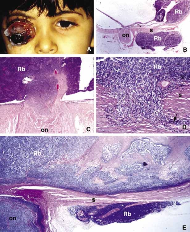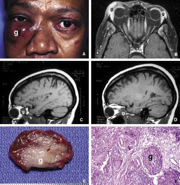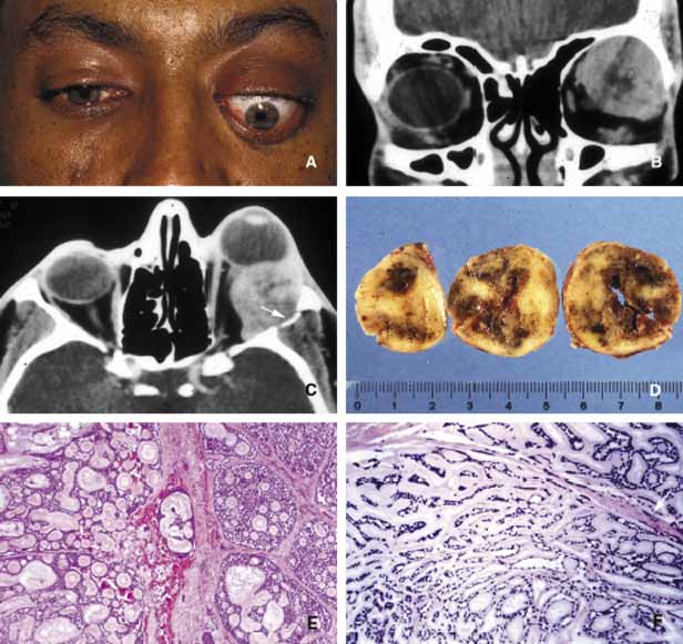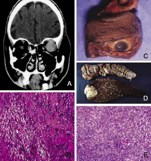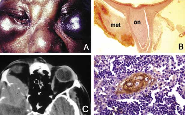 Patients with metastatic orbital tumors most frequently present with rapidly developing unilateral motility disturbance, painful proptosis, and, occasionally, a palpable mass.300,301 Imaging studies with CT and MRI provide information regarding the location of the tumor and the pattern of orbital involvement; however, they rarely offer any clues in terms of the primary site.302,303 Fine-needle aspiration biopsy (FNAB) is an effective method for histopathologic confirmation of orbital metastasis.304,305 In experienced hands, an adequate specimen is often obtained to provide material for routine, as well as special studies and the specimens should be evaluated by an experienced cytopathologist, knowledgeable in orbital diseases.306 False-negative results may be seen in tumors with prominent fibrous stromal reaction or hemorrhage, as well as in neoplasms that are surrounded with marked inflammatory response.307,308 Carcinoid tumors in the orbit may be primary or metastatic; the latter is reported to be a slowly growing circumscribed tumor with a long survival after surgical treatment.309,310 In approximately 10% of metastatic orbital tumors, the site of the primary lesion is unknown. This is a condition that is known as occult primary malignancy, in which the pathologist may play a pivotal role to identify the site of the primary neoplasm. For this purpose histochemical and immunohistochemical studies, polymerase chain reaction, chromosomal analysis, flow cytometry, and electromicroscopy may provide useful information in addition to the routine histopathological evaluation. In children, metastatic neoplasms to the orbit are predominated by small, round, blue-cell tumors, including neuroblastoma, Ewing sarcoma, granulocytic sarcoma, and Wilms tumor.311 Neuroblastoma is the commonest malignant tumor of infants, with an approximate incidence of 1 per 1000 live births, and it is the most common metastatic tumor to the orbit in this age group. Neuroblastoma is most often seen during the first year of life. As a matter of fact, it is the most common congenital neoplasm, which may be widely metastatic at birth, characteristically producing multiple subcutaneous and periocular metastatic lesions with ecchymosis (“blueberry muffin baby”).312 This tumor originates from primitive sympathicoblasts that normally would differentiate into ganglion cells. Microscopically it is made of round or oval, small round lymphocyte-like cells with hyperchromatic nuclei and minimal cytoplasm containing numerous mitotic figures (Fig. 33). Differentiating neuroblasts, ganglion cells, as well as rosette formations (Homer-Wright rosettes) may be seen in primary tumors. Once the tumor metastasizes, however, the features of neural differentiation are lost and it usually presents in the orbit with sheets of small, rounded cells.313 In these cases, ancillary techniques of histochemistry and immunohistochemistry may become valuable. Immunohistochemically, neuron-specific enolase (NSE) and S-100 neurofilament (NF) proteins are useful markers for neuroblastoma. Approximately 75% of the affected children excrete increased amounts of catacholomine byproducts, including vanillylmandelic acid (VNA), norepinephrine, homovanillic acid (HVA), and dopamine in the urine; this is very helpful in diagnosis. SECONDARY TUMORS Tumors extending or infiltrating into the orbit range from congenital malformations, hamartomatous and teratomatous lesions and reactive proliferations to highly malignant neoplasms such as retinoblastoma. The incidence of these lesions varies according to the definition of “tumors,” but they constitute approximately 10% of all orbital space-occupying lesions.314 Secondary orbital tumors may originate from the cranial bones and central nervous system tissues (meningioma, pituitary adenoma, craniopharyngioma),108,200,315,316 periorbital bones (osteoma and osteogenic sarcoma, giant cell-rich reactive lesions),276,277 paranasal sinuses and nasal cavity (squamous cell carcinoma),317 naso-lacrimal drainage apparatus (squamous cell carcinoma),318,319 globe, (uveal melanoma, retinoblastoma),320,321 (Fig. 34) and conjunctiva and the eyelids (squamous cell carcinoma, basal cell carcinoma, melanoma, and sebaceous gland carcinoma)314,320 (Fig. 35). As one can imagine, not only the histopathological features but also the clinical and radiologic manifestations vary, depending on the site of origin in the aforementioned secondary orbital tumors. | |||||||||||||||||||||||||||||||||||||||||||||||||||||||||||||||||||||||||||||||||||||||||||||||||||||||||||||||||||||||||||||||||||||||||||||||||||||||||||||||||||||||||||||||||||||||||||||||||||||||||||||||||||||||||||||||||||||