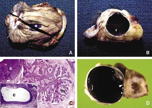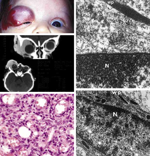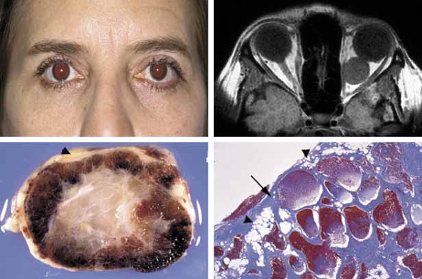Many metastatic neoplasms originating from other organ systems may find their way to the orbit by hematogenous spread. The most common metastatic malignancies include breast, lung and kidney carcinomas, cutaneous melanoma and rarely sarcomas originating elsewhere in the body.160–162 Tumor-like conditions such as pseudotumors, granulomas, congenital lesions (hamartomas, choriostomas, etc.) that may also invade orbit secondarily are covered elsewhere in this chapter. Both the clinician who evaluates the patient with an orbital space occupying lesion and the pathologist who examines the tissue removed from an orbital mass, must have a working knowledge of the frequency of orbital neoplasms and tumor-like conditions163–166 (Table 4). More commonly encountered acquired orbital neoplasms are detailed. PRIMARY TUMORS Epithelial Neoplasms Primary epithelial neoplasms of the orbit originate from the ductal and acinar epithelium of the lacrimal gland.167,168 The most commonly encountered lacrimal gland tumor is pleomorphic adenoma (benign mixed tumor) (BMT). This neoplasm is known as a “mixed” tumor because it is composed of a mixture of epithelial and stromal elements (Fig. 14). The epithelial elements of the tumor consist of glandular and ductal formations that may develop squamous metaplasia and small keratin filled cysts. The stroma is composed of myxoid tissue that may contain cartilage and bone. In most cases the BMT of the lacrimal gland is multilobulated and surrounded by a fibrous capsule. If additional smaller lobules are present in the vicinity of the main lesion, these satellite nodules are individually encapsulated as well. When malignancy develops within a BMT it is classified according to its predominant histopathologic component as adenocarcinoma within pleomorphic adenoma, adenoid cystic carcinoma, or poorly differentiated carcinoma. Malignant transformation may happen as a rapid growth within an unknown tumor or may take place decades after diagnosis of the BMT.169 Adenoid cystic carcinoma, the most common malignant tumor of the lacrimal gland may also develop de novo. This is a highly malignant neoplasm that can be seen in adolescents and may develop rapid extension into the adjacent structures including the cranium by direct invasion and to the base of the skull by painful perineural invasion.170,171 The histopathologic appearance of adenoid cystic carcinoma may present as several variants including the most common “Swiss cheese” pattern that consists of cribriform clustering of small basophilic tumor cells surounded by thick basement membrane (Fig. 15). Other types including diffuse basaloid, sclerosing, tubular, and comedocarcinoma are known to exist.172 Both benign and malignant tumors of the lacrimal gland present with proptosis and inferior medial displacement of the globe that can readily be demonstrated on CT and MRI studies showing cavitation of the lacrimal fossa in chronic benign lesions and direct invasion of the bony tissues in malignant tumors. Adenocarcinoma developing in BMT (pleomorphic adenocarcinoma, malignant mixed tumor) presents with atypical features within tubular and glandular structures.169 Mucoepidermoid carcinoma of the lacrimal gland consists of diffuse proliferation of atypical squamous cells with abundant vacuolated cytoplasm containing mucin. The clinical course of mucoepidermoid carcinoma is chronic with a relatively favorable prognosis.173,174 Other than true neoplasms, cystic dilatation of the lacrimal gland ductules that is known as dacryops and ectopic lacrimal gland tissue presenting in areas away from the anatomic site of the gland also present as space occupying lesions in the lacrimal fossa.175–177 Mesenchymal Neoplasms The traditional grouping of the primary vascular tumors in the orbit include capillary and cavernous hemangiomas, lymphangioma and arteriovenous malformations. The current thinking is that these lesions represent hamartomas that are made of different tissue components and may be better defined as “vascular hamartomatous lesions.”178 Histopathologic examination of these tumors often reveals mixtures of above listed tissue elements, the symptomatology, clinical course and response to treatment depends on the predominating histopathology. For example, if capillary hemangioma is the dominating element of a vascular tumor it is most often apparent at birth or within the first year, occurs in the anterior orbit and gradually regresses without any treatment. 179 Approximately 70% of capillary hemangiomas regress completely by 7 years of age. Patients with orbital capillary hemangioma may also have similar lesions in other organs. If systemic involvement is extensive, secondary thrombocytopenia known as Kasabach-Merritt syndrome develops. These lesions grossly appear as bright red, strawberry-like masses; histopathologically they are made of sheets of vascular endothelial cells with small lumen formations. Basement membranes surrounding these cells can be clearly identified with a reticulin stain. The predominating cell of the lesion is confirmed to be endothelial cell, by the positive staining for factor VIII, CD31 and CD34. The identification of an intracytoplasmic organelle known as Wiebel-Palade body by transmission electron microscopy also confirms the nature of the tumor cell as vascular endothelium (Fig. 16). For adnexal and orbital capillary hemangioma the treatment options include observation, intralesional and systemic corticosteroids, systemic interferon and in some cases surgical excision and radiation therapy.180–182 Another type of orbital tumor that originates from blood vessels is hemangiopericytoma, which is a pseudoencapsulated spindle cell tumor composed of vascular pericytes183 (Fig. 17). In these tumors the reticulin network surround the individual tumor cells in hemangiopericytoma as opposed to small groups of epithelial cells in capillary hemangioma. In hemangiopericytoma the tumor cells 