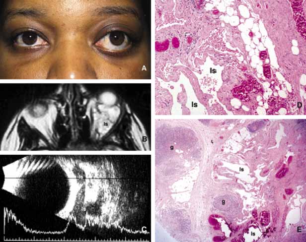 AMYLOIDOSIS Clinical features of orbital amyloidosis include proptosis and ocular motility disturbance and upper lid ptosis secondary to soft tissue infiltration322 (Fig. 36). The amyloid diseases are a diverse group of disorders, which can present as hereditary or sporadic forms. In these diseases, a hyaline material that is known as amyloid is deposited extracellularly in many tissues including fat, skeletal muscle, neural tissues, kidneys, adrenal glands, and, rarely, in the orbit.323 Orbital disease is manifested in most instances as a part of a systemic disorder such as multiple myeloma, rheumatoid arthritis, tuberculosis, etc.323,324 The most common types of amyloidosis are associated with multiple myeloma and primary amyloidoses. In plasma cell dyscrasias, a so-called protein AL is deposited in the affected tissues. In the primary amyloidosis, however, the deposited protein is known as AA, an amyloid derived from serum protein A and alpha-1 globulin. Both deposits AA and AP are insoluble, abnormal proteins and when they accumulate within the tissues, the normal architecture is distorted and thereby the tissue becomes dysfunctional. Under the light microscope the tissue deposits of amyloid appear as homogeneous, eosinophilic, hyaline material that stains orange/red with Congo-red technique and reveals a characteristic apple green birefringe under a polarizing filter. Amyloid deposits are also identified with crystal violet and thioflavin-T stains as well as with immunohistochemical stains that are specific for the AP and AA proteins.325 Ultrastructural examination reveals characteristic 6 to 10 nanometers branching fibrils arranged in a haphazard fashion without a distinct periodicity.326 In contrast with the systemic disease, focal amyloidosis in the orbit is a very rare disorder and may present as either a mass lesion or a diffuse infiltration involving fibroadipose tissues, lacrimal gland and/or extraocular muscles.327,328 The localized deposition of amyloid within the lacrimal gland presents with the enlargement of the gland, molding to adjacent structures and frequently with punctate calcification that is best depicted with CT.329 With MRI, amyloid deposits reveal low signal on T2-weighted images. With both CT and MRI, amyloid deposits demonstrate virtually no contrast enhancement with gadolinium.327 Extramedullary plasmacytomas occasionally may mimic amyloidosis when they are localized in the lacrimal and salivary glands.330 COLLAGEN TISSUE DISEASES Lupus erythematosus,331,332 dermatomyositis,333–335 rheumatoid arthritis,336,337 scleroderma,338–340 polyarteritis nodosa,342,343 angiolymphoid hyperplasia (Kimura disease),344–347 Behçet disease,348 and Churg-Strauss syndrome.349 are also known to involve orbit occasionally, and form diffuse and/or localized inflammation. ENOPHTHALMOS In great majority of orbital diseases, patients develop proptosis and displacement of the globe. It is important to remember, however, that in certain conditions the clinical presentation may be just the opposite, namely, the patient develops enophthalmos instead of exophthalmos.350,351 Enophthalmos (posterior/inferior dislocation of the globe) may occur with two basic mechanisms: structural abnormality, most commonly secondary to penetrating or nonpenetrating trauma with fractured orbital walls, and fibrosis of the orbital soft tissues, secondary to a number of pathological causes, including chronic inflammation, radiation degeneration, neoplasia, etc. The structural abnormality may also be related to a congenital malformation of the sphenoid bone in neurofibromatosis. If the bony defect is large enough, the globe may develop enophthalmos. Last but not least, orbital fibroadipose tissue may develop scarring and atrophy secondary to a number of diseases including scleroderma, radiation exposure, aging, and lipodystrophy.352 |