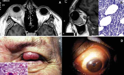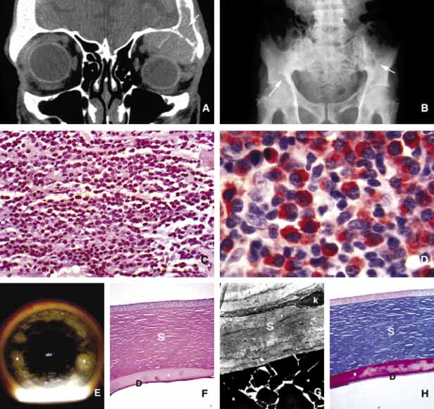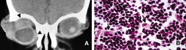 Dermatofibrosarcoma protuberans (DFSP), which consists of proliferation of atypical fibroblast-like spindle cells is best understood as an aggressive form of FH. Solitary fibrous tumor (SFT) is another type of spindle cell tumor, which can be encountered in the orbit as a slowly growing, well-delineated lesion.262–264 Giant cell fibroblastoma (GCF) is another fibrohistiocytic tumor, which is histologically benign without potential for metastasis, but may behave clinically as a destructive orbital tumor.265 Histiocytoses is another group of reactive, mass-forming lesions, which can be seen in the orbit. Currently histiocytoses are divided into two major categories as Langerhans (L) cell histiocytosis (formerly known as “histiocytosis X”) and nonLangerhans (nonL) cell histiocytosis, including xanthogranulomatos lesions in adults and children (Fig. 26),266–268 Orbital manifestations of Langerhans cell disease (histiocytosis X) are generally seen in younger patients than those of xanthogranuloma, with the peak ages being between 2 and 4 years.269,270 Both diseases present with space-occupying lesions in the orbit and develop compressive symptoms in the L and nonL varieties. In L cell proliferations, a systemic condition, Erdheim-Chester disease must be ruled out.271–273 Erdheim-Chester disease presents with the histiocytic infiltrates involving retroperitoneal soft tissues, kidneys, lymph nodes, lungs, heart, and bones.274,275 Fibrosseus Lesions Bone and cartilage tumors rarely originate from the anatomic structures of the orbit (Fig. 27). More often, these lesions develop in the neighboring periorbital, paranasal, and nasal bones and involve the orbit secondarily. Reactive fibrosseous and giant cell rich lesions, including fibrodysplasia, ossifying fibroma, giant cell reparative granuloma, brown tumor, aneurysmal bone cyst, etc. are more often seen in the orbital and periorbital regions than the true neoplasms. In the primary tumor category, osteoma and osteogenic sarcoma are the most common tumors. The histopathology of the osteoma varies from fibrous proliferation containing bone elements, to mature cancellous bone with very little fibrous tissue.277 Osteogenic sarcoma is the most frequently seen malignant tumor of the craniofacial skeleton, as well as the orbit and periorbital bones. These tumors are composed of pleomorphic spindle cells containing hyperchromatic nuclei and numerous mitotic figures with islands of neoplastic bone formations. Some of the malignant bone tumors in children are associated with EBRT and chemotherapy.278 Neoplasms of Blood and Lymphoid Cells Although leukemia is well-documented to infiltrate the ocular tissues, in more than 80% of the cases examined at autopsy, less than 2% of leukemia patients present with clinical manifestations. Orbital involvement in adult leukemia is far less than the ocular involvement that is particularly seen with leukemia in acute lymphoblastic disease279 (Fig. 28). In children, however, unilateral proptosis caused by acute leukemia is encountered, second only to rhabdomyosarcoma in frequency. Leukemic infiltrates of small round blue cells with scanty cytoplasm are seen in the extraocular muscles, meninges, optic nerve and fibroadipose tissues of the orbit. In 10% of cases bilateral disease may be present. Clustered myeloid leukemic cells forming a mass lesion in the orbit with or without systemic disease is known as granulocytic sarcoma. This tumor is also known as “chloroma” because it appears green on its cut surface secondary to its high myeloperoxidase content. The myeloid origin of the chloroma cells can be established with the Leder stain or by identifying the cytoplasmic granules or Auer rods in a touch-prep. If a solitary lesion develops before systemic disease, its recognition is extremely important to initiate early therapy. Lymphoma is the most common primary orbital malignancy in adults and can only be briefly covered here.280,281 Lymphoproliferative lesions account for approximately 10% to 15% of all orbital space occupying masses, yet these constitute only approximately 2% of all lymphomas in the body.282 The spectrum of orbital lymphoid proliferations include benign (reactive) lymphoid hyperplasia, atypical lymphoid hyperplasia, and lymphoma; Burkitt lymphoma, Hodgkin disease, and other lymphoplasmacyotid tumors are also seen in the orbit.279 Orbital lymphoma is usually unilateral but may involve both orbits and demonstrate a predeliction for the lacrimal gland fossa. It presents with painless proptosis and downward displacement of the globe, eyelid, and conjunctival edema with or without ptosis. CT and MRI confirm the presence of anteriorly located mass lesions that tend to be oval or oblong in shape and conform to the orbital bone and the globe like putty (Fig. 29). The clinical distinction between primary and secondary orbital lymphoma is not clear. Primary lymphomas are considered to be isolated to the orbit without any other extranodal site of involvement. Thus, by definition, primary orbital lymphomas are designated as stage I disease. However, if orbital disease is diagnosed concurrently with systemic lymphoma or the orbit is one of many extranodal sites of involvement, then it is considered to be secondary orbital lymphoma. Histopathologic evaluation of the biopsy is the most critical step in the workup of an orbital lymphoma patient to establish the diagnosis and formulate a management plan. Ideally, the biopsy tissue should be given to the pathologist without any fixative and in a sterile condition. The pathology personnel should be in charge of preparing touch-preps, smears, and allocating tissue for permanent and frozen section studies and also for flow cytometric immunophenotyping, molecular, genetic and immunohistochemical studies.281 If the histology reveals a composite of mature lymph follicles composed of B-cell lymphoblasts surrounded by a mantle zone of mature T-cells, the lesion is lab