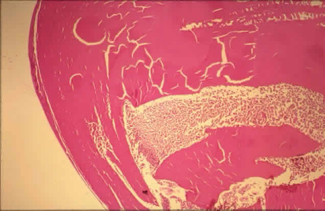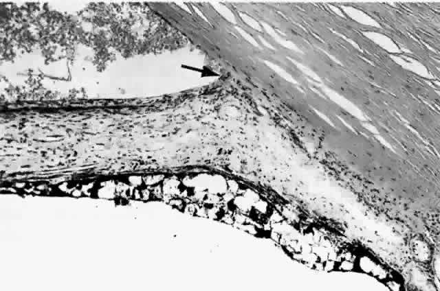 to death,19 whereas others have been less convinced of such a relationship.20 See Color Plate 1 for Color Figs. A through G These glycogen vacuoles can rupture when the intraocular pressure is suddenly reduced, resulting in a cloud of pigment granules carried anteriorly in the aqueous fluid. This pigment may then be phagocytosed by the corneal endothelium. The pupils of patients with diabetes often dilate poorly, and the amount of glycogen in the pigment epithelium may correlate to damage to the dilator muscle. Rubeosis iridis is a clinical term for the reddish discoloration imparted by neovascularization of the iris surface. It is associated most frequently with retinal ischemia and neovascularization, and indicates the presence of a diffusible vascular proliferative factor secreted by the retina.21 Initially, the vessels can be quite difficult to see. With more advanced rubeosis, there may be ectropion uveae, an eversion of the posterior iris surface at the pupil margin. The earliest location of the new vessels has been a matter of longstanding debate. They appear at the pupil margin and in the angle virtually simultaneously, subsequently spreading across the iris surface, but gonioscopic examination is required for the vessels to be seen in the angle. In some patients, the vessels do form in the angle before being perceptible at the pupil margin.22 Peripheral anterior synechiae form rapidly after neovascularization of the iris, closing off the trabecular meshwork and giving rise to so-called neovascular glaucoma, which is difficult to treat. In addition, the vessels and associated fibrous tissue can proliferate across the pupil, sequestering it. Particularly in aphakic patients, the vessels can also extend through the pupil and onto the posterior iris surface. Histologically the new vessels are located anterior to the anterior border layer of the iris (Fig. 3, Color Fig. B). They are thin-walled, unlike the normal thick-walled iris stromal vessels. New vessels may be located only at the pupillary margin and in the angle at the iris root, corroborating the clinical finding.18 Scanning electron microscopy has disclosed a thin, transparent layer of myofibroblastic proliferation anterior to the new vessels. This explains the clinical observation that the anterior iris surface appears smoothed out, with loss of the collarette and crypts typically seen on the normal iris surface. Myofibroblasts have contractile properties and thus may be responsible for the angle closure of neovascular glaucoma and also for the eversion of the posterior iris surface at the pupillary margin (Color Fig. C).23 |