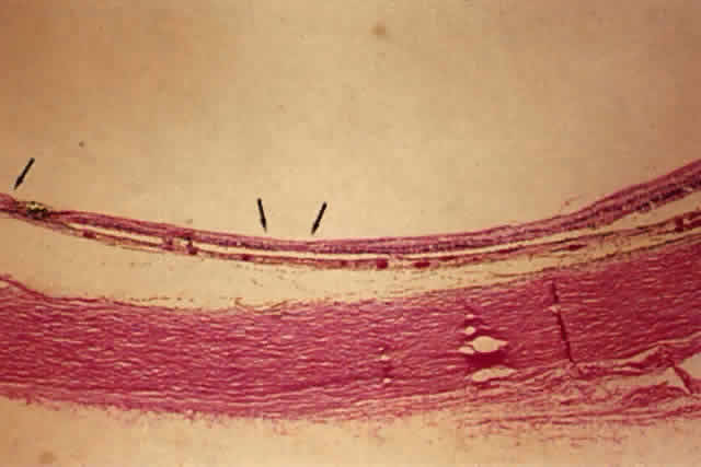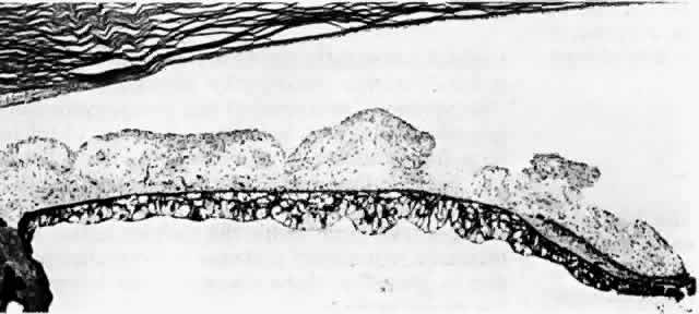 basement membrane of the nonpigmented epithelium is also thickened, but