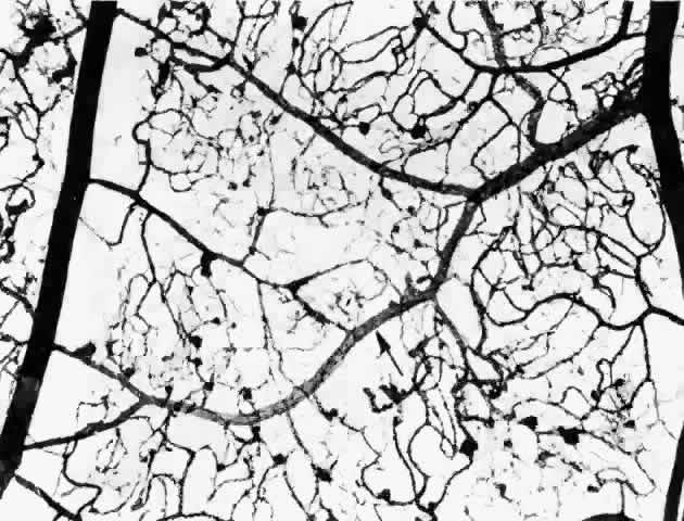surface. In fact, it is not known what prompts the development of diabetic retinopathy, although ischemia clearly plays a role.25 Certain alterations have been observed in blood from diabetic patients, including increased rigidity and aggregation of the erythrocytes, altered platelet activity, changes in plasma proteins, and increased affinity of hemoglobin for oxygen. Both the increased aggregates of platelets and the abnormally rigid erythrocytes can occlude small blood vessels, contributing to retinal ischemia. The increased affinity of hemoglobin for oxygen means that less oxygen is released to the tissues.26 Whether tightly controlling blood sugar levels improves retinopathy or even halts its progression is controversial. In one investigation,27 dogs were made diabetic and put into three groups: good control for 5 years, poor control for 5 years, and poor control for 2½ years followed by good control for the remaining time. The third group had developed almost as many microaneurysms at 5 years as did the group under poor control for the entire time. This study indicates that tight control is maximally beneficial when undertaken early in the course of the disease. Human studies to corroborate or refute this have been understandably difficult to carry out. Transplantation of the pancreas or pancreatic islet cells is one way to normalize blood glucose by restoring endogenous insulin. In one study, eight patients who received pancreatic transplants exhibited no difference in retinopathy between the four whose transplants functioned and the four whose transplants failed.28 In another small study, the proliferative retinopathy of patients who received pancreatic transplants remained stable or worsened, despite their being euglycemic.29 Recently, results from a large prospective series, the Diabetes Control and Complications Trial, have shown that tight control, including three or more daily insulin injections or continuous infusion, based on at least four glucose determinations daily, does prevent development or progression of retinopathy to a significant degree. All patients in the primary prevention group had diabetes for 5 years or less and did not have retinopathy at the outset of the study. Thus, tight control begun early may indeed help prevent or delay the onset of retinopathy.30 As noted previously, duration of disease is a strong predictor for development of retinopathy.31,32 Prepubertal children may develop minimal retinopathy,33 but the blood-retinal barrier is altered during puberty, apparently through hormonal influence, leading to retinopathy.34 Unless the macula is edematous, nonproliferative retinopathy is asymptomatic and may be found only on routine ophthalmoscopy. In patients who develop diabetes after puberty, retinopathy may be a presenting sign of the disease. The earliest manifestation of diabetic retinopathy is the appearance of microaneurysms (Fig. 5, Color Fig. D). They appear as small red dots clinically and often are seen more readily on fluorescein angiography, where they fill and leak, with staining of the vessel wall.35 Histologically they are small “outpouchings” of the capillary vessel wall and are usually saccular but occasionally fusiform in shape. They can occur anywhere along the capillary network between the arteriole and venule.18 Some microaneurysms, however, do not fill with fluorescein and have been shown to be thin-walled capillary outpouchings filled with erythrocytes. They may represent either one stage of microaneurysm formation or a specific type of it.36 As shown by trypsin digestion, capillary pericytes are lost first,27 followed by endothelial cells (Figs. 6 and 7). Aldose reductase, one of the enzymes in the sorbitol metabolic pathway, is present in significant quantities in retinal capillary pericytes, but not in endothelial cells, and may thus be implicated in the formation of microaneurysms.37 The final result is an acellular segment of capillary that is nonperfused on fluorescein angiography.36 The normal retinal vasculature, including the capillaries, forms a barrier to the free exchange of metabolites.38 This blood-retinal barrier is damaged in diabetes, allowing leakage of larger molecules, which are clinically manifested as hard exudates and retinal edema. Ultrastructurally, the normal junctions between capillary endothelial cells are disrupted.39 Hard exudates clinically appear as shiny yellow deposits (see Fig. 5; Color Fig. D). When they surround a microaneurysm in a circular pattern, the condition is called circinate retinopathy. Histologically, the deposits accumulate at the level of the outer plexiform layer (Fig. 8, Color Fig. E) and consist of lipids, complex carbohydrates, and proteins, as demonstrated histochemically. Hard exudates are normally asymptomatic unless they involve the macula, where they cause a drop in visual acuity. If a leaking microaneurysm can be identified on fluorescein angiography, laser photocoagulation can obliterate it. Over time, the fluid is resorbed, and sometimes visual acuity can improve.40 Cystoid macular edema can be caused by many different diseases as well as diabetes. It is characterized by diffuse leakage of the capillaries in the posterior pole. In advanced cases, the cystoid spaces are ophthalmoscopically visible, resembling the petals of a flower. Cystoid edema is seen more easily on fluorescein angiography, since the spaces fill with fluorescein. Histologically, cystoid fluid is seen at the outer plexiform layer, but may also accumulate in the inner nuclear layer. The synapses of the outer plexiform layer are slanted in the fovea because the inner retinal layers are pushed away from the foveal pit. Because of these slanted connections, this area can be distended by fluid more readily. Ultrastructurally, the fluid appears to be located within Müller cells, and there is evidence of capillary endothelial damage.41 In some patients, the cystoid spaces can coalesce, forming lamellar