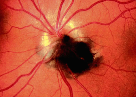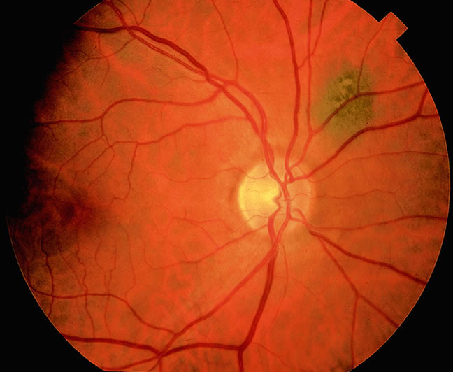and is rare in heavily pigmented individuals. The choroidal vessels