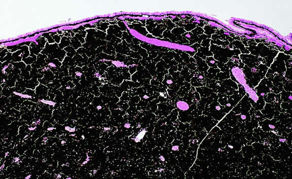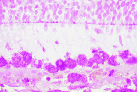 Choroidal melanomas produce abnormalities in the overlying retinal pigment epithelium including atrophy, hyperplasia, and the formation of drusen and drusenoid material.92 The overlying retina often shows photoreceptor loss and may develop cystoid edema. The latter tends to be more common in slower growing lesions, especially choroidal hemangiomas. After Bruch's membrane has ruptured, the vessels located in the mushrooming head of the tumor are often quite prominent, reflecting vascular stagnation caused by the compression at the waist of the tumor (see Fig. 22). Aggregates of macrophages that have ingested periodic acid-Schiff (PAS)-positive lipofuscin pigment and melanin from the damaged retinal pigment epithelium can be found in the subretinal fluid (Figs. 39 to 41). These are evident ophthalmoscopically as clumps of orange pigment that serve as a clinical marker for an actively growing neoplasm.80,81