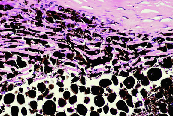 Uveal melanomas vary markedly in their pigment content. Some tumors are totally amelanotic; others are maximally pigmented. In some instances, distinct clones of tumor cells that vary in pigment content are evident on gross examination or even clinically (Fig. 25). A friable or granular appearance of the cut surface of a melanoma noted during gross examination may be indicative of necrosis or a tumor rich in poorly cohesive epithelioid cells. Melanomas that contain cystic cavities occasionally are encountered.85