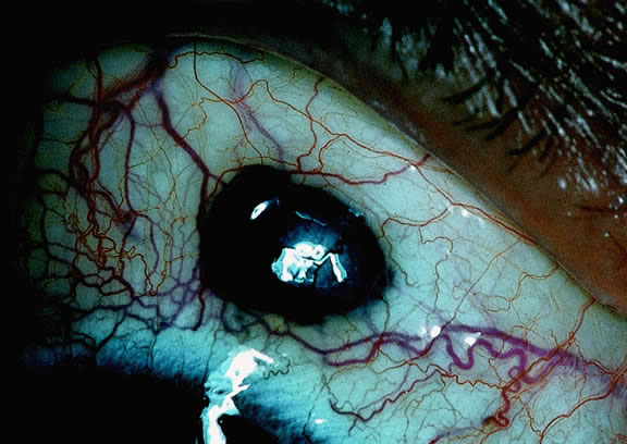 Most eyes with untreated uveal melanoma eventually develop glaucoma.74,75 Anterior tumors, that is, high-grade iris melanomas or ciliary body melanomas that invade the anterior chamber, typically cause secondary open-angle glaucoma by seeding or directly infiltrating the trabecular meshwork (Fig. 12). The latter often occurs in a circumferential or ring fashion. Posterior melanomas generally cause secondary angle closure glaucoma by stimulating iris neovascularization or by causing pupillary block. The pupil is blocked when large tumors or tumors that have caused highly elevated total retinal detachments displace the lens iris diaphragm forward (Fig. 13). The same mechanism also occurs in eyes with other neoplasms that typically are associated with high bullous retinal detachments such as uveal metastases, choroidal hemangiomas, and exophytic retinoblastomas. In such cases, severe pain often prompts a patient with a blind eye to seek medical care. More than a century ago, it initially was emphasized that a glaucomatous eye with a total retinal detachment harbors an intraocular tumor, typically a melanoma, until proven otherwise. Imaging studies such as ultrasonography are mandatory before therapy in such cases, especially if evisceration of a blind painful eye is contemplated instead of enucleation.