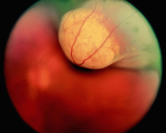 Retinal detachment is the most common cause of visual loss in eyes with posterior melanoma. Initially solid, the detachment becomes exudative as serous fluid accumulates. Visual loss initially may be caused by induced hyperopia as a subfoveal tumor displaces the retina anteriorly. The exudative detachment initially is localized; fluid accumulates in the subretinal space tented up by the growing tumor. Failure to find a retinal hole in a patient with retinal detachment should always raise the possibility of a choroidal tumor or some other choroidal process known to produce an exudative detachment. Total retinal detachments are found in some eyes with choroidal melanomas, generally those with larger or neglected tumors (see Fig. 13). Melanoma-bearing eyes with total retinal detachments often have secondary closed-angle glaucoma caused by pupillary block or iris neovascularization.74,75 Clumps of orange pigment may be seen in the subretinal space overlying the tumor (see Fig. 40).