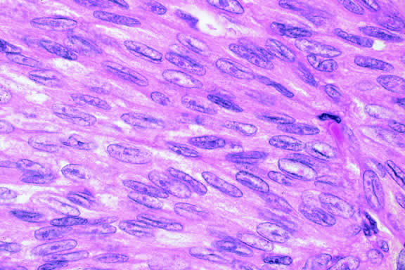Recent studies have shown that the rare disorder previously called reactive lymphoid hyperplasia of the uvea probably is a form of lymphoma214,215 (Fig. 55). Affected patients may have massive infiltration of the uveal tract by low-grade non-Hodgkin's B cell lymphoma that may have germinal centers. Contiguous extraocular foci of tumor also may be present.216 The latter provide an opportunity to establish the diagnosis without an intraocular biopsy. Lymphoid tumors of the iris and choroid have been reported in immunosuppressed patients with posttransplantation lymphoproliferative disorder.217–219 The lymphoid tumors are caused by Ebstein Barr virus, and some improve if immunosuppression is reduced.219 Juvenile xanthogranuloma generally affects the iris stroma in infants but can infiltrate the posterior uvea.220 It is an important cause of spontaneous hyphema. The infiltrate contains Touton giant cells rimmed with lipid. Several cases of posterior uveal involvement by Letterer-Siwe disease have been reported.221,222 LEIOMYOMA Leiomyoma is a relatively rare nonpigmented tumor of the uveal tract that usually involves the ciliary body and typically affects young women.223,224 During transillumination, leiomyomas often transmit light vividly. The latter attribute, occurring in a young woman, should suggest that a nonpigmented ciliary body tumor may be a leiomyoma and not an amelanotic melanoma. Although leiomyoma is benign, local resection is recommended to prevent complications from the growing tumor.223 Histopathologically, leiomyoma is relatively paucicellular compared with amelanotic melanoma, and its cells have fibrillar eosinophilic cytoplasm and bland nuclei with finely dispersed chromatin (Fig. 56). Positive immunoreactivity for smooth muscle actin (Fig. 57) and other muscle markers serves to differentiate leiomyoma from uveal melanoma and rare neurogenic tumors such as schwannoma, which also are paucicellular. The latter distinction is important because some leiomyomas have a distinctly neural appearance on routine light microscopy. The term mesectodermal leiomyoma has been applied to such tumors, emphasizing the derivation of intraocular smooth muscle from neural crest.225