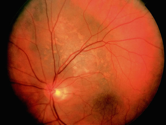 Necrotic melanomas may present with severe orbital and adnexal inflammation that can mimic infectious cellulitis or idiopathic orbital inflammation.48 Extensive necrosis typically is found in eyes with rapidly growing high-grade tumors. Marked elevation of intraocular pressure in eyes with secondary glaucoma may cause infarction of the tumor and other intraocular structures. Unsuspected melanomas occasionally are discovered when blind painful eyes with opaque media are examined pathologically. Before the advent of ultrasonography as many as 10% of blind painful eyes were said to harbor previously undiagnosed tumors.79 The possibility of a tumor should always be entertained when cataract is unilateral or asymmetric. It is quite embarrassing to diagnose a melanoma during cataract surgery. CLINICAL SIGNS. Ophthalmoscopic examination of a choroidal melanoma typically reveals a sessile or dome-shaped pigmented mass located deep to the retina (Figs. 16, 17, and 18). There often is an associated secondary nonrhegmatogenous serous detachment of the retina. Orange pigment may be located on the surface of smaller lesions.80,81 Tumors vary in pigment content and may be heavily pigmented or totally amelanotic. The differentiation of a totally amelanotic melanoma from uveal metastasis, hemangioma, lymphoma, or osteoma may be difficult. Compared with metastasis, melanoma usually is more highly elevated and drusen and RPE proliferation more evident on its surface. Ophthalmoscopy also typically shows well-defined vessels within melanoma.48 Ancillary studies such as fluorescein angiography and ultrasonography may be necessary to make the diagnosis.