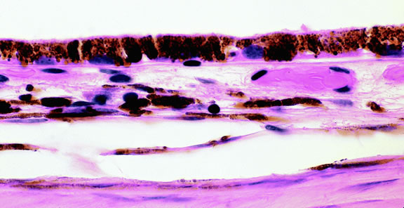 pigment is contained within the cytoplasm of dendritic uveal melanocytes, which