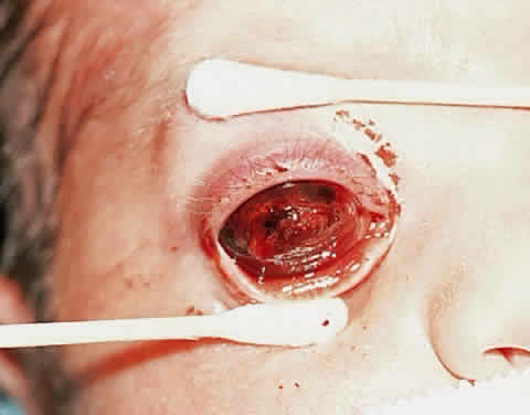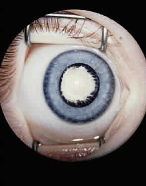 Strabismus or ocular misalignment occurs in about one third of cases and may herald a relatively small tumor that involves the fovea. For this reason, careful ophthalmoscopy should be performed in all children with strabismus to exclude retinoblastoma or some other significant retinal pathology. About half of the eyes enucleated for retinoblastoma have iris neovascularization, which may produce neovascular glaucoma, iris heterochromia, and even secondary buphthalmos. Pupillary block glaucoma caused by anterior displacement of the lens-iris diaphragm may be found in eyes with exophytic tumors and total retinal detachments. Endophytic tumors and the rare diffuse infiltrating variant of the disease often seed the anterior chamber, forming a pseudohypopyon of tumor cells that may be initially misdiagnosed as inflammation. An orbital cellulitis-like picture is another type of pseudoinflammatory presentation. In such cases, histopathologic examination usually reveals severe neovascular glaucoma that has caused extensive infarction of the tumor and other intraocular structures. In underdeveloped countries, patients may present in the late stages of the disease with a tumor that has extended extraocularly, causing exophthalmos and an orbital mass. Rare tumors are manifest at birth. Congenital retinoblastoma may present with a massive hyphema and an enlarged ectatic cornea that spontaneously perforates (Fig. 5).