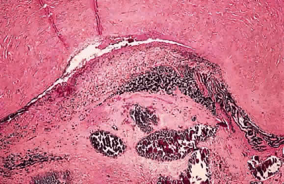 foci (Fig. 14). Viable parts of a retinoblastoma appear blue because they are composed of poorly differentiated neuroblastic cells that have scanty cytoplasm and intensely basophilic nuclei (Fig. 15). Many mitoses and fragments of apoptotic nuclear debris usually are present. Retinoblastoma grows rapidly and has a marked propensity to outgrow its blood supply and undergo spontaneous coagulative necrosis. This usually occurs when the proliferating cells have extended about 90 to 110 μm away from a blood vessel (see Fig. 15). The necrotic tumor cells lose their basophilic nuclear DNA and become pink or eosinophilic. The residual viable cells typically form cuffs or sleeves around vessels, imparting a multilobulated or papillary appearance to some tumors. These perivascular cuffs were called pseudorosettes by some in the past. Foci of dystrophic calcification develop in the necrotic parts of the tumor in many cases. Histopathologically, the calcific foci appear reddish-purple in hematoxylin-and-eosin sections, and the presence of calcium can be confirmed by the von Kossa or alizarin red stains. Electron microscopy suggests that calcification probably begins in the mitochondria of necrotic cells. Clinically, the demonstration of calcification by ultrasonography or computed tomography can help to differentiate retinoblastoma from other simulating lesions. Intensely basophilic deposits of DNA released from necrotic tumor cells are another characteristic histopathologic feature of retinoblastoma. DNA deposition generally is found in eyes with extensively necrotic tumors. Typically, the DNA deposits surround retinal or iris vessels or are found in the trabecular meshwork or in basement membranes such as the lens capsule or the internal limiting membrane of the retina. |