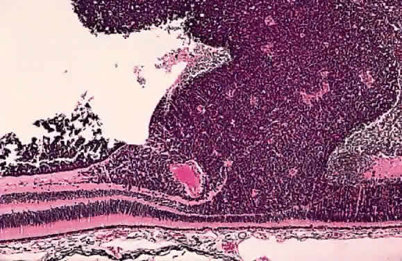 the retina (Fig. 13). The basophilic tumor usually contains eosinophilic and reddish-purple