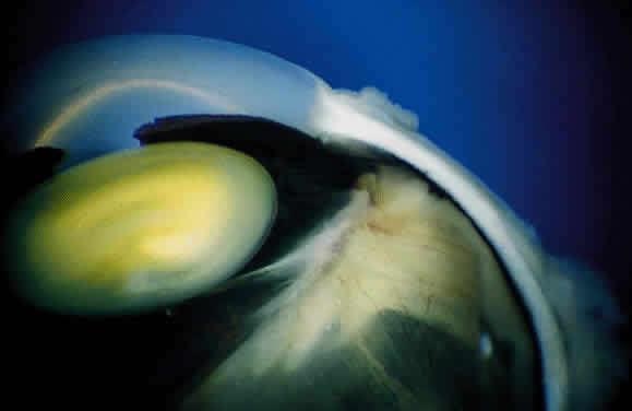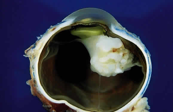 After a retinoblastoma has filled the globe and destroyed its contents, it extends extraocularly. Anteriorly, extraocular extension occurs through the aqueous outflow pathways, pre-existing emissarial canals, or perforations in the cornea. Posterior segment tumors that have invaded the choroid can extend extraocularly along emissarial canals or can invade the orbit by directly infiltrating and destroying the sclera. Patients from underdeveloped countries often present with orbital masses of tumor tissue, which contain ocular remnants, mainly sclera. Secondary buphthalmos and staphylomas caused by secondary glaucoma can facilitate extrascleral extension. Secondary closed-angle glaucoma caused by pupillary block or iris neovascularization is relatively common in eyes with retinoblastoma. Angiogenic factors such as VEGF produced by the tumor cells or the ischemic retina are the probable cause of the iris neovascularization. The optic nerve is the most common avenue for extraocular extension by retinoblastoma. Retinoblastoma has a marked proclivity to invade the optic nerve (Fig. 9). Some degree of optic nerve invasion was present in 29.5% of 814 retinoblastomas reported by Magramm and coworkers. In this respect, the behavior of retinoblastoma contrasts sharply with that of choroidal melanoma, which invades the optic nerve only 5% of the time. The tumor may travel to the brain along the parenchyma of the nerve or via the subarachnoid space, or both. Rare tumors can travel around the chiasm and reach the posterior aspect of the fellow eye. Retinoblastoma cells also can be disseminated widely through the cerebrospinal fluid in the subarachnoid space.