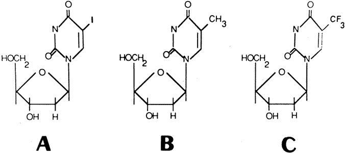| Trifluridine (5-trifluoromethyl-2'-deoxyuridine, trifluorothymidine), like IDU, is a thymidine analog, but