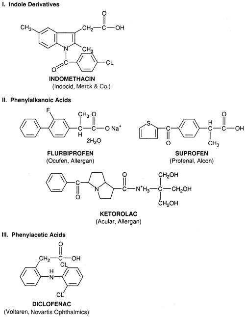 solution, Bausch & Lomb, Rochester, NY). Voltaren Ophthalmic Solution is approved for use in inhibiting postoperative inflammation following cataract surgery and for the temporary relief of pain and photophobia after refractive surgery. It is available in 2.5-mL and 7.5-mL volumes dispensed within 5-mL and 10-mL bottles, respectively. This preparation includes diclofenac 0.1%, boric acid, edetate disodium, polyoxyl 35 castor oil, purified water, sorbic acid, and tromethamine adjusted to a pH of 7.2. This ophthalmic solution is supplied in a dropper-tip, plastic squeeze bottle that can be stored at room temperature (59°F to 86°F or 15°C to 30°C). The medication should be protected from light. The manufacturer suggests one drop of solution four times daily beginning 24 hours after cataract surgery and continuing throughout the first 2 weeks of the postoperative period. One drop can be given 1 hour before refractive surgery and 15 minutes after the procedure is completed. Thereafter, one drop is administered four times daily for as long as 3 days. Ketorolac tromethamine 0.5% ophthalmic solution is available in three different formulations: Acular 0.5% Ophthalmic Solution, Acular LS Ophthalmic Solution, and Acular PF Ophthalmic Solution (Allergan). Acular 0.5% Ophthalmic Solution is available in 3 mL, 5 mL, and 10 mL volumes each within an opaque plastic bottle 5 mL, 10 mL, and 10 mL, respectively, each with a controlled dropper tip. In addition to ketorolac tromethamine 0.5%, these solutions contain benzalkonium chloride 0.01%, edetate disodium 0.1%, octoxynol 40, sodium chloride, and purified water with an adjusted pH of 7.4. This preparation is approved by the FDA for use following cataract surgery for the treatment of postoperative inflammation with treatment initiated 24 hours after surgery and given one drop four times daily for 2 weeks. It is also approved for the relief of ocular itching caused by seasonal allergic conjunctivitis and is recommended by the manufacturer as one drop four times daily. Acular PF Ophthalmic Solution is available as a sterile solution supplied in single-use vials within a package containing twelve single use vials each containing 0.4 mL of solution. This preservative-free solution contains only ketorolac tromethamine 0.5%, sodium chloride, hydrochloric acid and sodium hydroxide to adjust pH to 7.4, and purified water. This preparation is indicated for the reduction of ocular pain and photophobia after incisional refractive surgery. Acular LS Ophthalmic Solution is indicated for the reduction of ocular pain and burning/stinging after cataract surgery. It is supplied as a 5 mL volume within a 10-mL bottle. This ophthalmic preparation contains ketorolac tromethamine 0.4%, benzalkonium chloride 0.006%, sodium chloride, edetate disodium 0.015%, octoxynol 40, purified water and is adjusted to a pH of approximately 7.4. It is best stored at 15°C to 25°C or 59°F to 75°F and protected from light. These ophthalmic NSAIDs are available throughout the world where they are approved for different ophthalmic indications including treatment of allergic conjunctivitis, inhibition of intraoperative miosis during cataract surgery, temporary relief of pain and photophobia after refractive surgery, prevention of postoperative inflammation after cataract surgery, and the prevention and treatment of cystoid macular edema after cataract surgery. In addition, Indomethacin 1% Ophthalmic Suspension is available outside of the United States in a 5-mL dropper bottle. Pharmacists are trained to prepare NSAID ophthalmic eyedrops by dissolving crushed tablets or the contents of capsules in artificial tears or other vehicles in an aseptic or sterile procedure. However, if improperly prepared, the result can be a potentially dangerous ophthalmic product. For example, 12 hospitalizations in western Pennsylvania, eastern Ohio, and West Virginia for ocular infections were reported in newspapers throughout the United States during the 1990s. Two of these cases required enucleations (Associated Press, San Francisco Chronicle, February 1991). Therefore, a properly qualified pharmacist with a special interest in ophthalmic pharmacology and the compounding of ophthalmic preparations is a requirement for the extemporaneous preparation of NSAID ophthalmic dose forms. |
