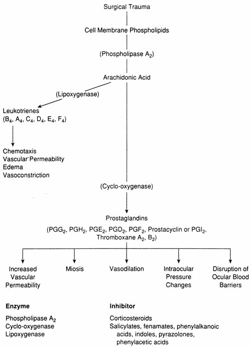 PHARMACODYNAMICS PG research began with Ambache's study of “irin” more than 60 years ago, but the chemical identification of this endogenous mediator occurred subsequently. Many of the major advances in understanding these autacoids have occurred in the past two decades.36 PGs produce many physiologic effects within the eye, including miosis, conjunctival hyperemia, increased permeability of the blood–ocular barriers, and changes in intraocular pressure.37–40 Furthermore, PGs have become recognized as potential chemical mediators of both cellular and humoral aspects of inflammation and allergy.41–43 Aspirin and other NSAIDs decrease the synthesis of PGs by inhibiting cyclooxygenase (COX), the enzyme that catalyzes the formation of endoperoxides from arachidonic acid. In addition, indomethacin has shown inhibitory activity against phospholipase A2 and C. There is little evidence that NSAIDs inhibit lipoxygenase, except at concentrations higher than those achieved therapeutically; therefore, NSAIDs have limited ability to inhibit the generation of leukotrienes, as shown in Figure 2.44–48 However, diclofenac may indirectly limit leukotriene production by sequestration of arachidonic acid into triglyceride pools.49 This would enhance its anti-inflammatory activity because leukotrienes possess chemotactic activity. Although it is tempting to summarize the pharmacodynamics of NSAIDs by thinking of them simply as COX inhibitors, it is unlikely that this single mechanism accounts for all their pharmacologic effects. Different hypotheses have been suggested. These agents, at higher concentrations, blunt the functions of inflammatory cells such as polymorphonuclear leukocytes. Investigators have described how NSAIDs inhibit the aggregation of polymorphonuclear leukocytes. These drugs inhibit calcium movements and enhance the poststimulation increase in intracellular cyclic adenosine monophosphate (cAMP); these actions could alter the early steps of neutrophil activation. NSAIDs have a free radical scavenger action. As stated previously, they inhibit peripheral blood monocyte phospholipase C activity. In addition, NSAIDs may indirectly reduce vascular permeability.7,22,47,50–54 NSAIDs are anionic, planar molecules that can partition into lipids, such as those found in cell membranes and particularly in the acid environments provided by inflammation. Many membrane effects are likely related to the ability of aspirin like drugs to insert into the plasma membrane's lipid bilayer where they can disrupt protein–protein interactions and normal signaling events. These drugs inhibit membrane-associated nicotinamide adenine dinucleotide phosphate (NADPH) oxidase activity, uptake of precursor arachidonate, transmembrane anion transport, and mitochondrial oxidative phosphorylation.47,55–57 Finally, at high doses; NSAIDs inhibit nonprostaglandin activities, such as proteoglycan synthesis by chondrocytes and chemoattractant binding.58–61 Despite these qualifications, the inhibition of COX activity does appear to correlate with the therapeutic usefulness of NSAIDs in ophthalmology (i.e., the inhibition of intraoperative miosis, the modification of postoperative inflammation, the prevention and treatment of CME after cataract surgery, the relief of excessive pain and photophobia after refractive surgery and the treatment of allergic conjunctivitis). Most NSAIDs inhibit not only PGs at sites of inflammation but also PGs that serve to assist with important functions throughout the body. Such inhibition may be harmful as described within the toxicity section of this chapter. The tendency for NSAIDs to impair normal gastrointestinal mucosal function with associated mucosal damage can result in serious gastrointestinal complications. A prospective trial of more than 8,000 patients with rheumatoid arthritis who were taking NSAIDs found the rate of serious gastrointestinal complications to be 1.54% per year.62 NSAIDs are among the most widely used therapeutic agents with approximately $2 billion spent in the United States on prescription NSAIDs alone.63 This means thousands of patients are at risk each year. CycloOxygenase Isoforms A potentially useful approach to avoiding some of the complications of NSAID treatment became possible with the identification of two isoforms of COX: COX-1 and COX-2. COX-1, a constitutive enzyme, synthesizes PGs that regulate physiologic processes. It is present in most tissues and, therefore, normally expressed in the gastrointestinal tract, kidneys, platelets, and vascular endothelium when it plays a role in their normal physiologic function. COX-2 is an inducible enzyme that is expressed throughout the body primarily during inflammatory responses, and in association with pain or in relation to fever. However, COX-2 may be constitutive, to some degree, in the absence of inflammation, within body sites such as the brain and kidneys.64 The development of NSAIDs that preferentially inhibit COX-2 provides the potential for relieving pain and inflammation without the adverse effects of COX-1 blockade.65 The advantages of this approach have been questioned in that some believe the enzymatic inhibitory activities demonstrated in vitro may not reflect COX inhibition in human tissues and, therefore, there is some question whether the COX-1 sparing effect translates into prevention of untoward effects during treatment.66 Furthermore, the clinical studies most often quoted that conclude that patients have a 50% (VIGOR Study) to 70% (CLASS Study) decreased gastrointestinal toxicity while using COX-2 inhibitors report a reduction of complicated confirmed upper gastrointestinal events from 1.4% to 0.6% (VIGOR Study) and 1.2% to 0.44% (CLASS Study). Therefore, while the percentages discussed are impressive they reflect relatively small numbers of patients.67,68 Finally, the cardiovascular safety of COX-2 inhibitors has recently been questioned. After the demonstration of an increase 