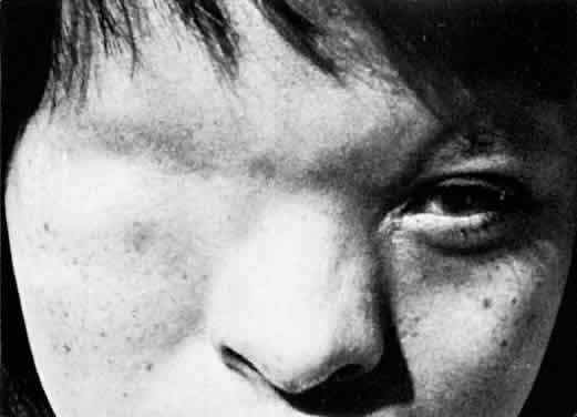 CRYPTOPHTHALMOS In cryptophthalmos, a sheet of skin covers the eye.4 This sheet is continuous with the skin of the periorbital area. The horizontal fissure and lashes are absent (Fig. 15). This skin may be the most anterior surface of the underlying globe, with the skin substituting for or fusing with underlying corneal tissue. The globe is usually microphthalmic, with the lens defective or absent and the anterior chamber usually shallow or even nonexistent.207 Fraser's syndrome is inherited in an autosomal-recessive manner, and cryptophthalmos is present in 85% of affected children. In those cases in which cryptophthalmos is present, 72% have bilateral involvement. Other features of this disorder include mental retardation, cardiac anomalies, genitourinary anomalies, cleft lip and palate, ear and nose anomalies, and syndactyly.208,209