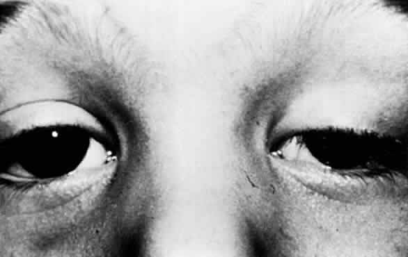EYELID COLOBOMAS An eyelid coloboma is characterized by a triangular defect, with the base of the notch directed primarily at the margin.4 Usually the defect in the upper lid is between the inner and middle third of the lid, whereas in the lower lid the defect is usually located between the middle and outer third of the lid. Colobomas of the upper lid are often found in Goldenhar's syndrome.119 When eyelid colobomas and epibulbar dermoids are found concomitantly, the lid notch often fits over the dermoid. Lid colobomas may result from the defective fusion of temporal and nasal waves of mesodermal tissue.4 In addition, experiments suggest that ischemia of the rapidly differentiating lid complex could cause infarction of the part of the eyelid that is farthest from the principal blood supply and result in a notch. CONGENITAL PTOSIS Congenital ptosis (blepharoptosis) is a common anomaly characterized by an inability to elevate a drooping eyelid. The deformity may be minimal and remain almost unnoticeable. In marked cases, however, the skin fold normally present at the site of the levator attachment to the skin may be absent (Fig. 16). It occurs more commonly as a unilateral condition, and it is inherited as an autosomal-dominant disorder with relatively high penetrance.212–215 Congenital ptosis is caused by abnormal development of the levator muscle involving a deficiency of striated muscle fibers. Fibrous replacement of these fibers occurs and leads to the typical finding of limited downward excursion of the eyelid (lid lag).216