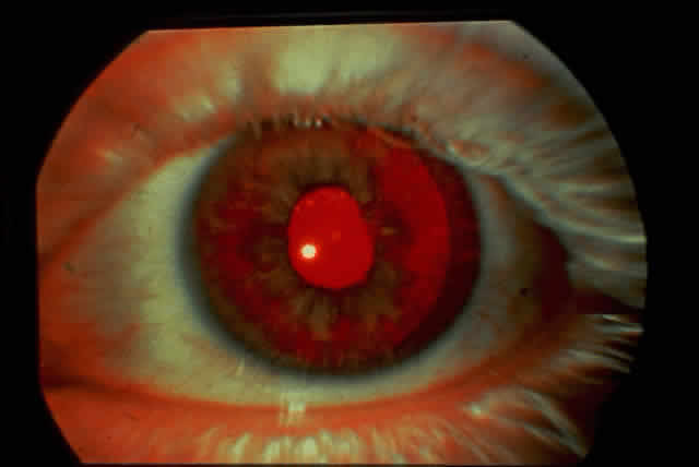 X-linked ocular albinism is characterized by the presence of macromelanosomes and it is divided into two types: type 1 (Nettleshi-Falls type) and type 2 (Forsuus-Erikssontype).96 These patients demonstrate foveal hypoplasia, hypopigmentation of the retina and decreased visual acuity. The skin pigmentation, however, is normal. The OA1 gene has been mapped to chromosome Xp22.2- p22.3,97 whereas the OA2 gene is located in the Xp21.3-21.2 region.98 There are two types of oculocutaneous albinism: tyrosine-negative (type 1) and tyrosine-positive (type 2). Patients with tyrosine-negative (type 1) oculocutaneous albinism typically have no pigment in their hair at birth, and the amount of pigment in the skin and eyes is scarce. The OCA1 gene locus has been mapped to chromosome 11q14-21, where the tyrosinase gene is located. The human tyrosinase gene consists of five exons. The length of genomic DNA is more than 50 kb.99 Tyrosinase is initially translated into a 529-amino-acid polypeptide, which is subsequently cleaved to produce the mature tyrosinase protein.100,101 Various mutations have been detected in the tyrosinase gene in patients with oculocutaneous albinism type 1.102,103 The most common type of mutation is a single base substitution that gives rise to a different amino acid in the tyrosinase protein product.93 A striking feature of patients with these tyrosinase mutations is that most of them are compound heterozygotes with different mutant alleles, hence the wide range of tyrosinase expression and the corresponding severity of oculocutaneous albinism type 1 seen clinically. Clinically, patients with tyrosine-positive oculocutaneous albinism -(OCA2) have pigmented hair at birth, and the amount of pigmentation in the skin and eyes increases with age. The OCA2 gene locus has been mapped to human chromosome 15q11.2-q12. The OCA2 gene has been shown to be a homologue of the mouse pink-eyed dilution gene. The OCA2 gene product appears to function as part of melanosomal membrane and is involved in the transport of tyrosinase. Clinical diagnosis of oculocutaneous albinism using these findings is proving to be feasible. One of the major difficulties in the molecular genetic screening and prenatal diagnosis of oculocutaneous albinism type 1 is that there appears to be no hot-spot mutation in the tyrosinase gene, making it necessary to examine the entire gene sequence to search for mutations. This is analogous to the situation with retinoblastoma, in which no hot-spot mutation in RB1 has been identified. Screening for OCA1 patients using rapid screening techniques such as heteroduplex/SSCP has proved useful.95 In terms of treatment, there is evidence that loading the diet with excess tyrosine may be an effective therapy for patients with OCA2.104,105 ANIRIDIA Molecular genetic studies of aniridia have provided a fascinating opportunity to examine the molecular mechanisms of ocular embryogenesis. Since the early demonstration of the 11p13 locus for autosomal-dominant aniridia and the association between sporadic aniridia and Wilms' tumor, significant advances have been made in this field in recent years, leading to the identification of the human aniridia gene (PAX6). Aniridia comprises a group of closely related panocular disorders with a common feature of iris hypoplasia (Fig. 3). Aniridia patients also can have a wide range of ocular findings, including cataract, foveal hypoplasia, nystagmus, corneal pannus, glaucoma, ectopia lentis, optic nerve hypoplasia, and strabismus. Aniridia can be genetically inherited either as an autosomal-dominant or an autosomal-recessive disorder (Gillespie's syndrome).106,107 It is well known that the sporadic form of aniridia is associated with Wilms' tumor, a pediatric nephroblastoma.108 The combination of sporadic aniridia and Wilms' tumor is commonly referred to as WAGR syndrome. This may appear to be somewhat peculiar, since the familial form of the disease (autosomal-dominant or autosomal-recessive) is not associated with Wilms' tumor.109 This apparent contrast is explained by the fact that PAX6 is located on chromosomal 11p13, in the vicinity of the gene for Wilms' tumor.45,46,110,110a In the autosomal-dominant form of aniridia, the DNA alterations involved are often minor (point mutations or small deletions) and affect only the aniridia locus, sparing the Wilms' tumor locus. In contrast, in the sporadic form of aniridia, there is often a large deletion of the gene segments involving the loci of both aniridia and Wilms' tumor, resulting in the clinical presentation of both diseases.
