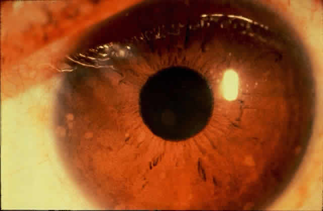 Stargardt's macular dystrophy is typically transmitted as an autosomal-recessive disease. A locus for the recessive form of the disease has been mapped to the short arm of chromosome 1.305 Recently, two chromosomal loci have been identified for the dominantly transmitted form of the disease, one on the long arm of chromosome 13 and the other on the long arm of chromosome 6.306,307 Butterfly-shaped pigment dystrophy is a relatively rare macular dystrophy characterized by bilateral, symmetric pigmentary changes resembling the shape of a butterfly.308–311 Patients typically present with progressive atrophic changes in the fovea and a gradual decrease in vision. Mutations have been found in the human peripherin/RDS gene of patients with this disease.312–314 RDS stands for “retinal degeneration slow,” a homologue of the mouse gene.315 Peripherin is a membrane-associated glycoprotein found in the outer segments of photoreceptors and is thought to provide structural stability to photoreceptor discs. The peripherin/RDS gene has been mapped to human chromosome 6p. Mutations in this gene have also been identified in patients with ADRP.289,316 NEUROFIBROMATOSIS Neurofibromatosis is a neuro-oculocutaneous syndrome that consists of types 1 and 2. Neurofibromatosis type 1 is also known as peripheral neurofibromatosis or von Recklinghausen's disease. Clinical presentations include neurofibromas, café-au-lait spots, and Lisch nodules of the iris (Fig. 13). Other ocular findings in this type include iris, choroidal, and retinal hamartomas; optic nerve gliomas and meningiomas; and retinal astrocytic hamartomas.