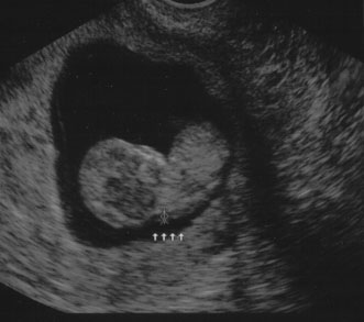 Nuchal edema is an echo-free space between the skin line and the soft tissue overlying the cervical spine. Nuchal edema is caused by subcutaneous accumulation of fluid and has diverse etiology, including aneuploidies, cardiovascular and pulmonary defects, skeletal dysplasias, congenital infections, and hematologic and metabolic disorders. A nuchal translucency (NT) is obtained between 10 and 13 weeks' 6 days' gestational age (Fig. 8).31 A study at King's College Hospital in London found an NT of 3 mm was associated with a 4-times increase in the maternal age related risk for aneuploidy. An NT greater than 4 mm resulted in a 29 times increased risk for trisomies 21, 18, and 13. Additionally, with a 4 mm or more NT, there was a high incidence of other anomalies and poor prognosis, whereas with just 3 mm and a normal karyotype, the outcome was usually normal. Table 8 lists the disorders associated with an increased nuchal translucency thickness.