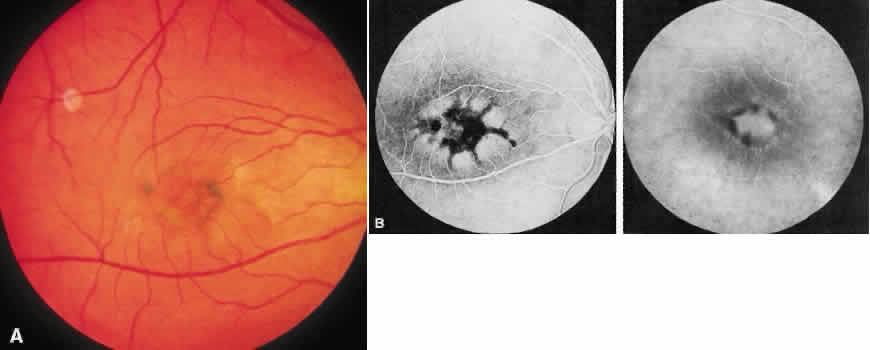 | Five patients from three successive generations had an unusual maculopathy.92 In the earliest stages there was a “yellowish refractile sheen with red fenestrations within the sensory retina.” In older persons, there were RPE abnormalities, including a bull's-eye maculopathy. |